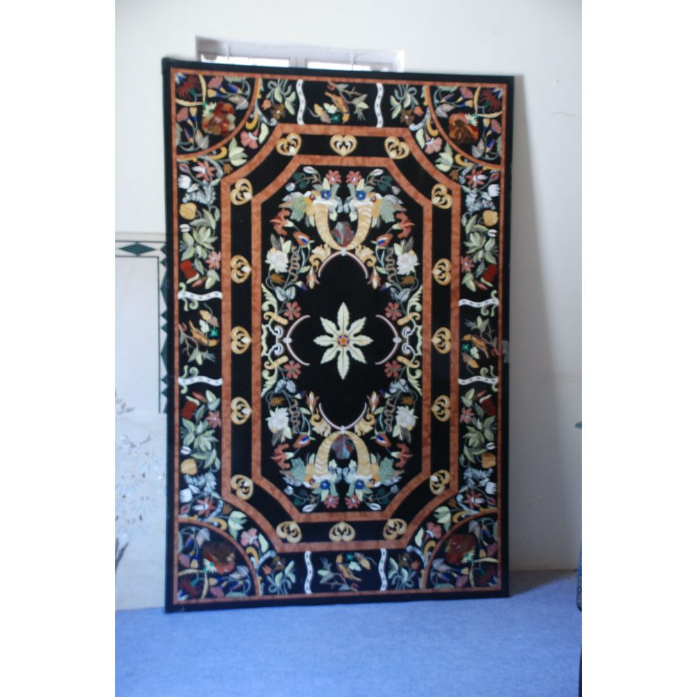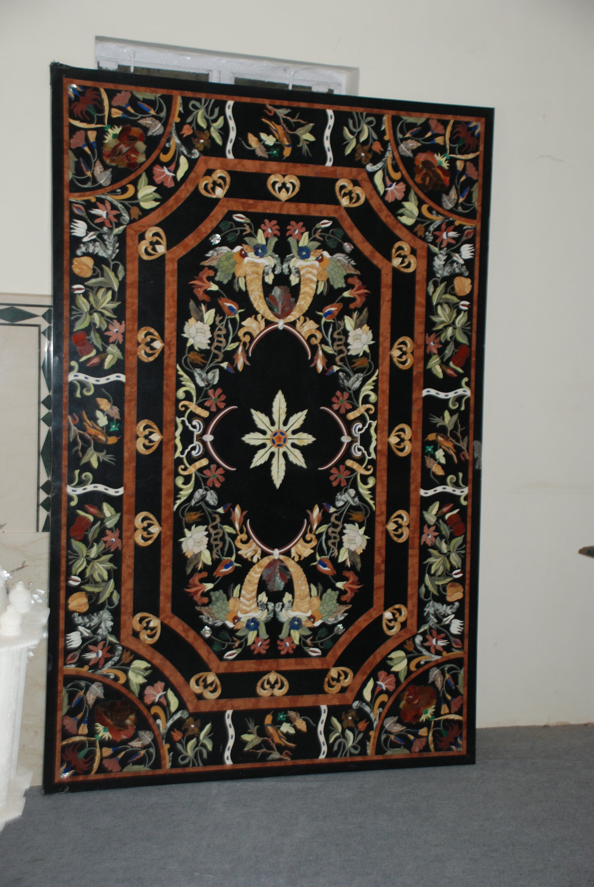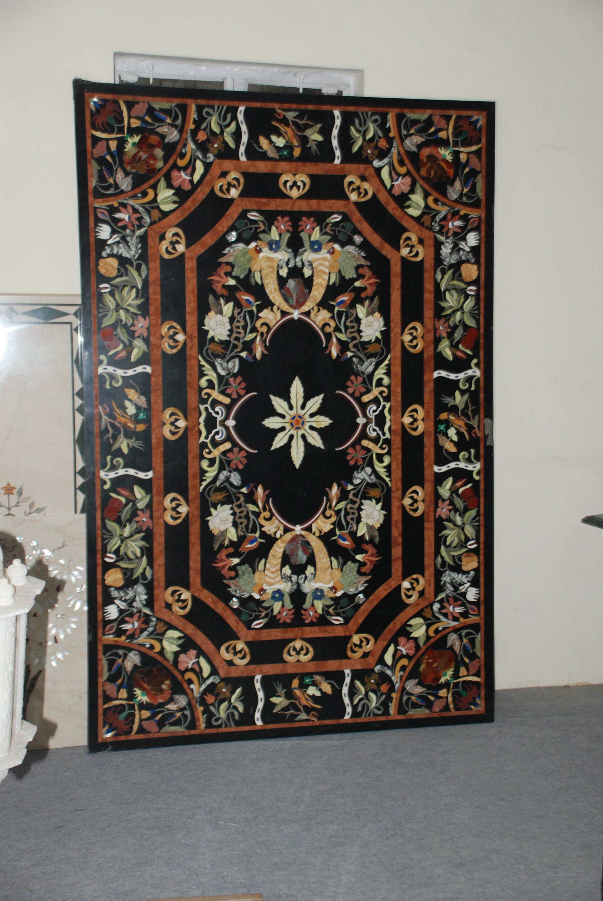 This amazingly beautiful and intricate carpet type detail is made in Black marble, inlaid with exotic colours of marble and Semi precious stones.