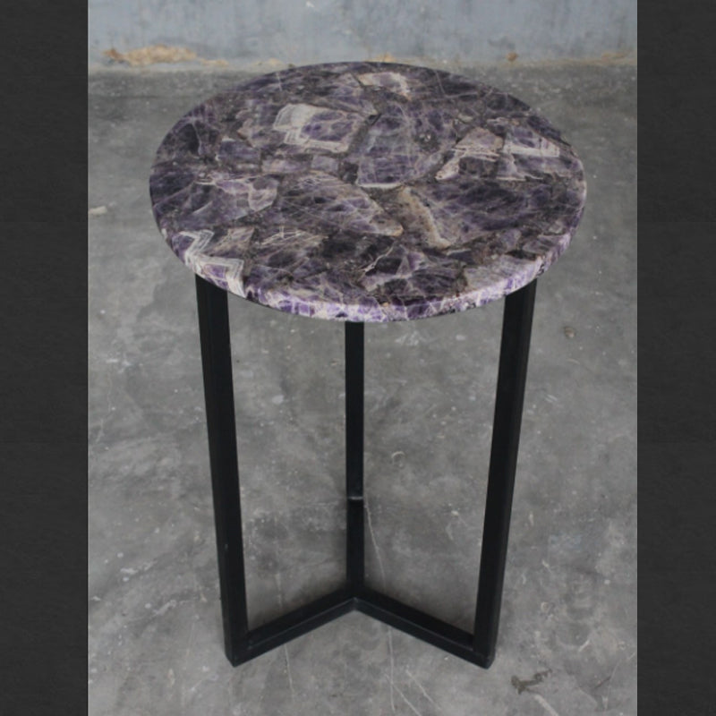 An amethyst table is a table made with amethyst gemstones. Amethyst is a purple variety of quartz that is often used in jewelry and decorative objects. In the case of an amethyst table, the tabletop would be made up of amethyst crystals or slices of amethyst geodes that have been polished and arranged to create a flat surface. These tables are often used as statement pieces in home decor or in spaces such as spas and meditation rooms where the calming and healing properties of amethyst are valued. They can range in size from small accent tables to large dining tables and can be custom-made to fit a specific design aesthetic. However, due to the rarity and high cost of amethyst, these tables tend to be quite expensive and are considered luxury items.