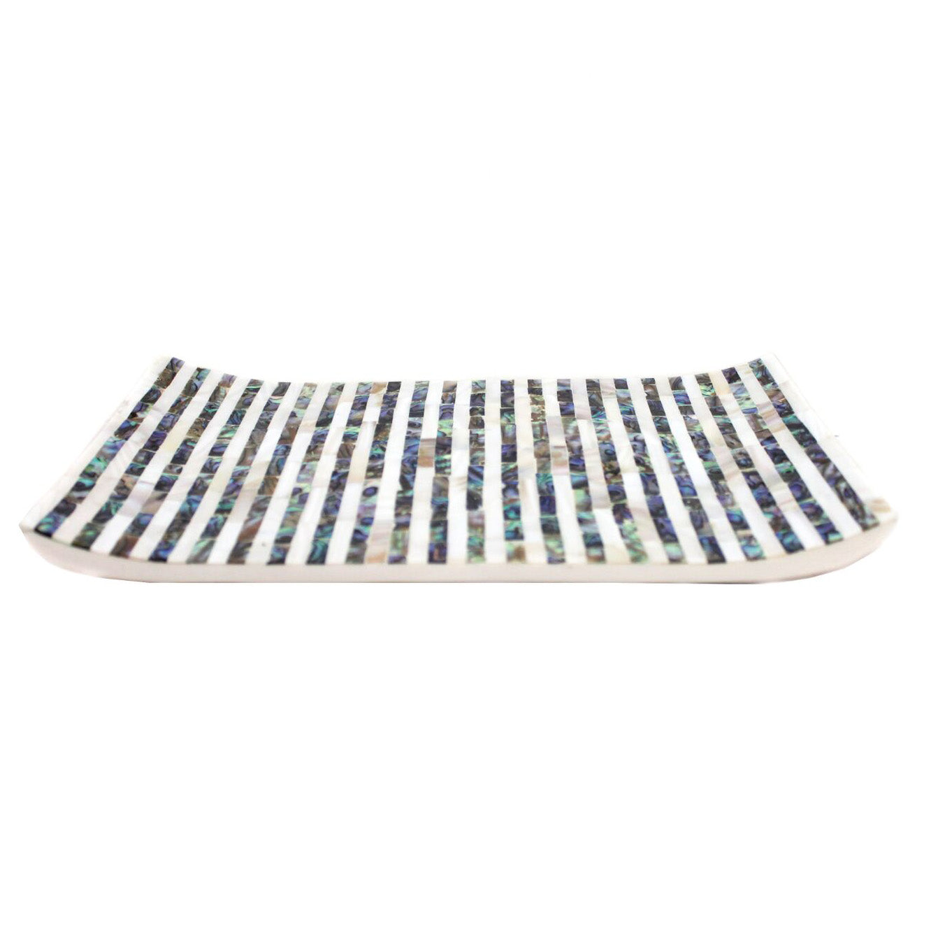 It is made of polyresin with multiple line of green mother of pearl. The tray is multi utility, can be used as serving tray, platter, decorative , towel tray etc.. The weight is 502 gms.