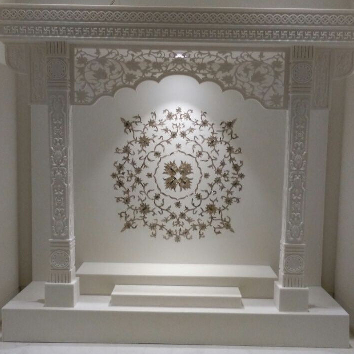 Typical Home Mandir with mandala made in abalone mother of pearl as a back drop and inlay on the top facia.