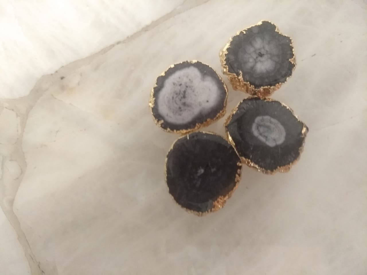 Stones used in this jewellery are solar quartz. Metal used is brass. For plating first copper is used, then silver and finally flash of gold is added to give it colour. This is a set of 4 kurta buttons. No two pieces will be same as its natural stone.... The size varies because of stone but will fix in kurta Country of Origin - India"