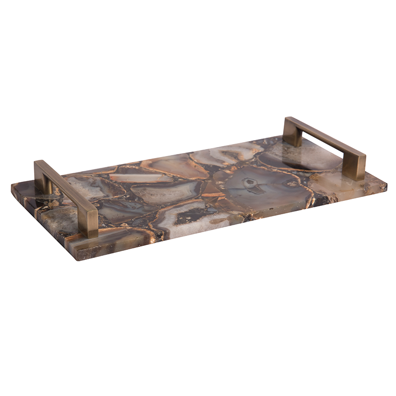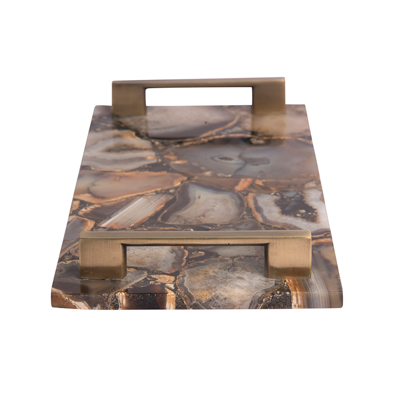 The tray is made of agate. This agate in color is natural and called wild agate.
