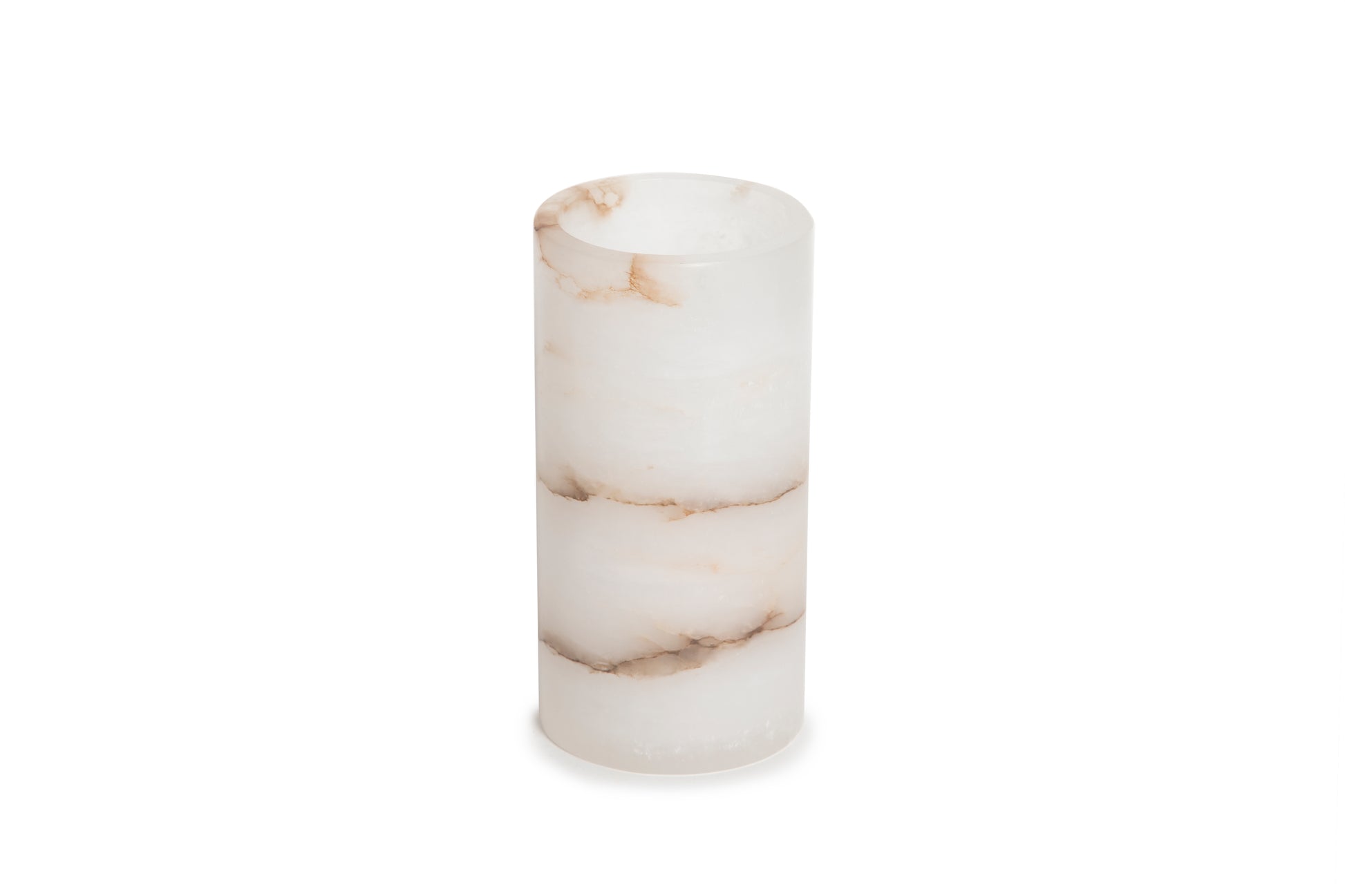 It is made of Alabaster stone. It has multiple use. A votive, a flower vase, candle holder.