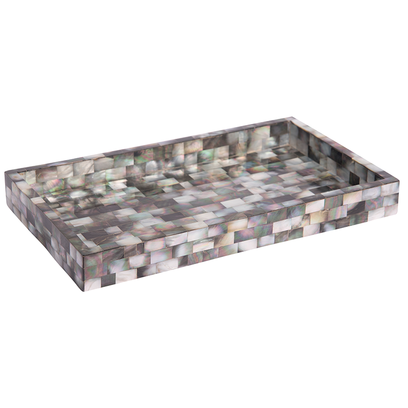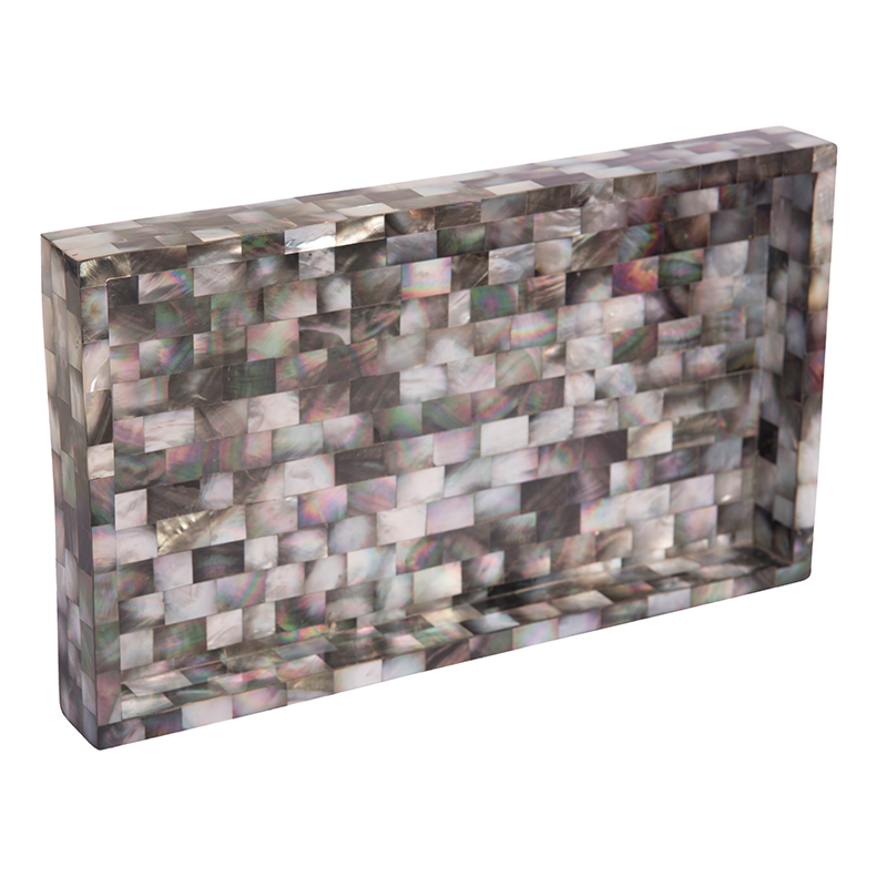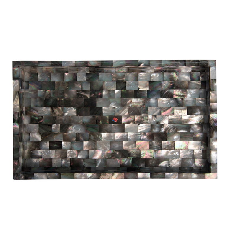 It is made of mdf board, black mother of pearl is pasted over it. The tray is multi utility, can be used as serving tray, platter, decorative , towel tray, mini bar tray etc.