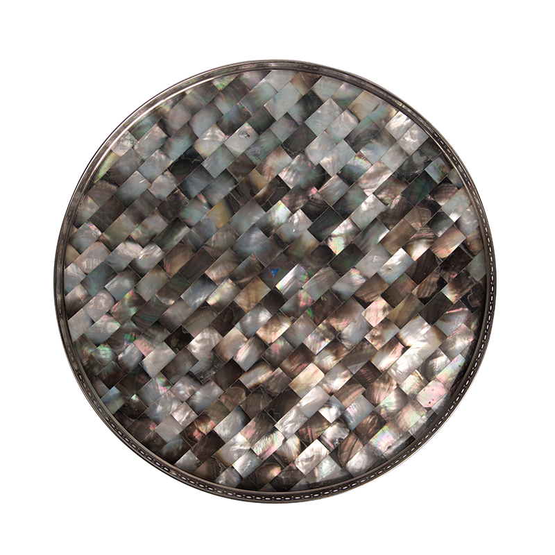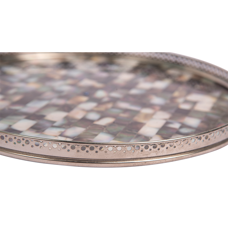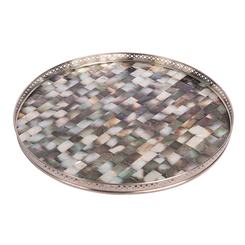 It is made of mdf, with metal frame all around. The black mother of pearl pasted on mdf. It is multipurpose tray. It enhance the beauty of your table. The size is 11 inches.