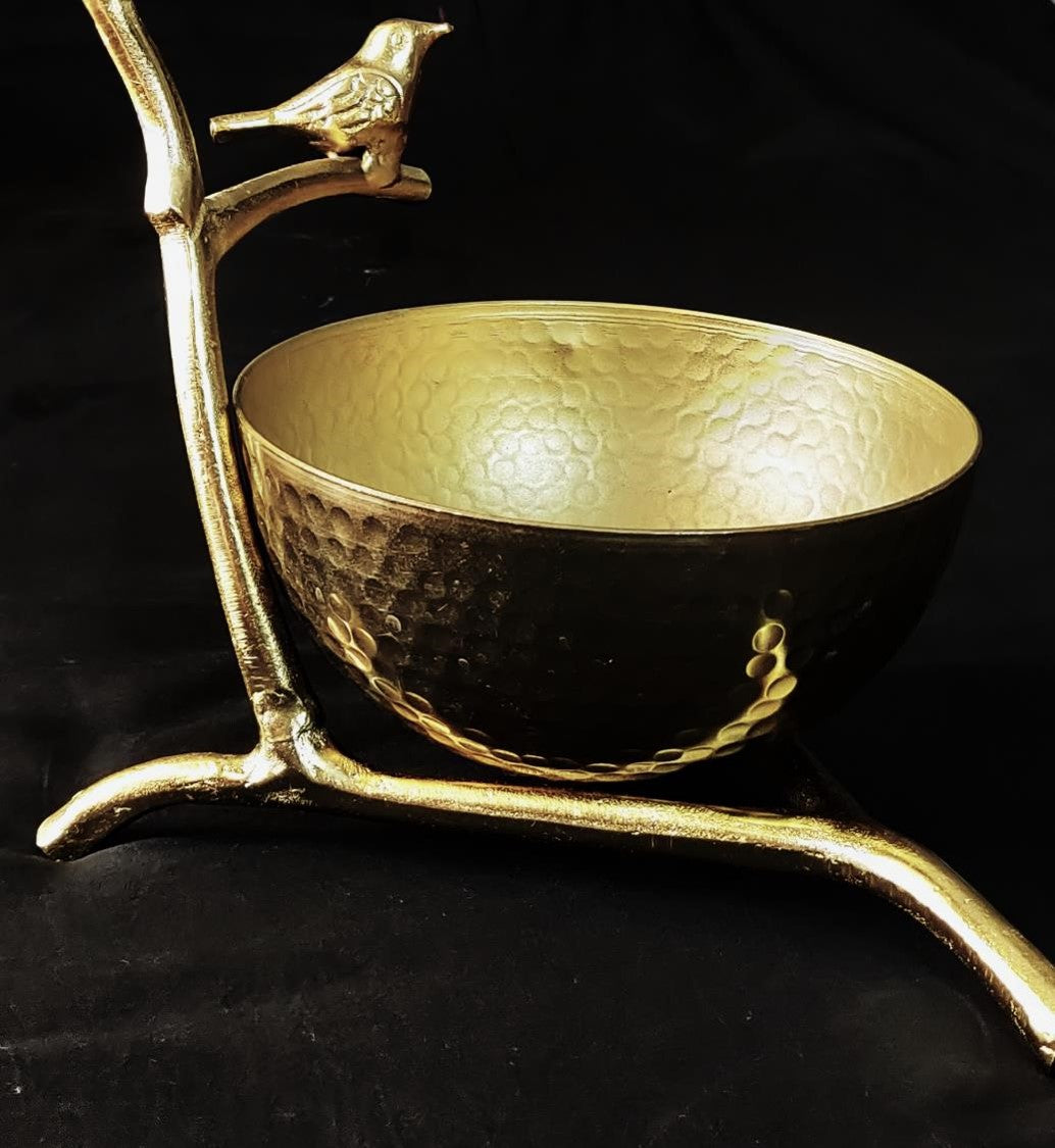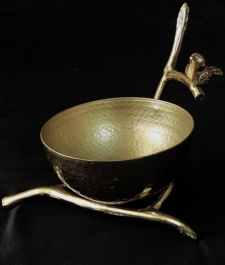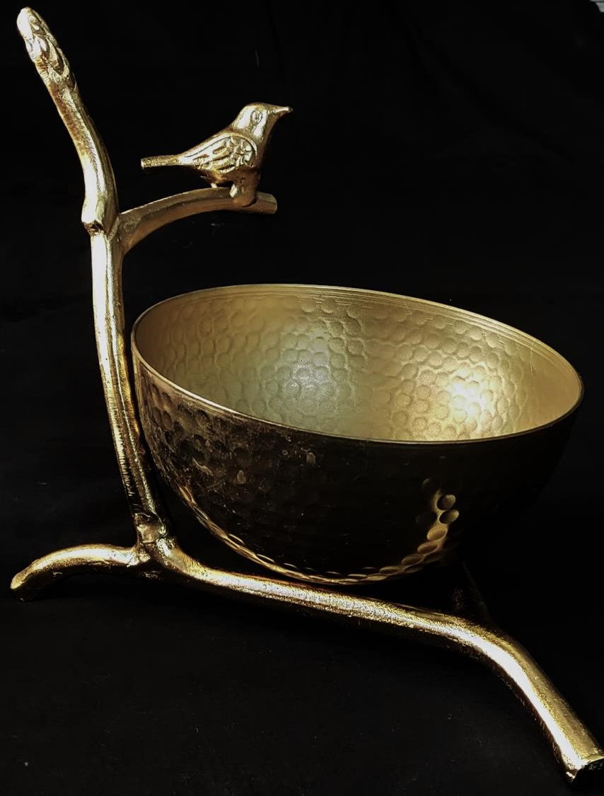 It is made in aluminum with gold EPL. It is a decorative fruit bowl, to make is easy to clean, the bowl is not fixed but kept separately in the metal branch. The size of the bowl is 6 inches diameter to 5 inches height. approx.