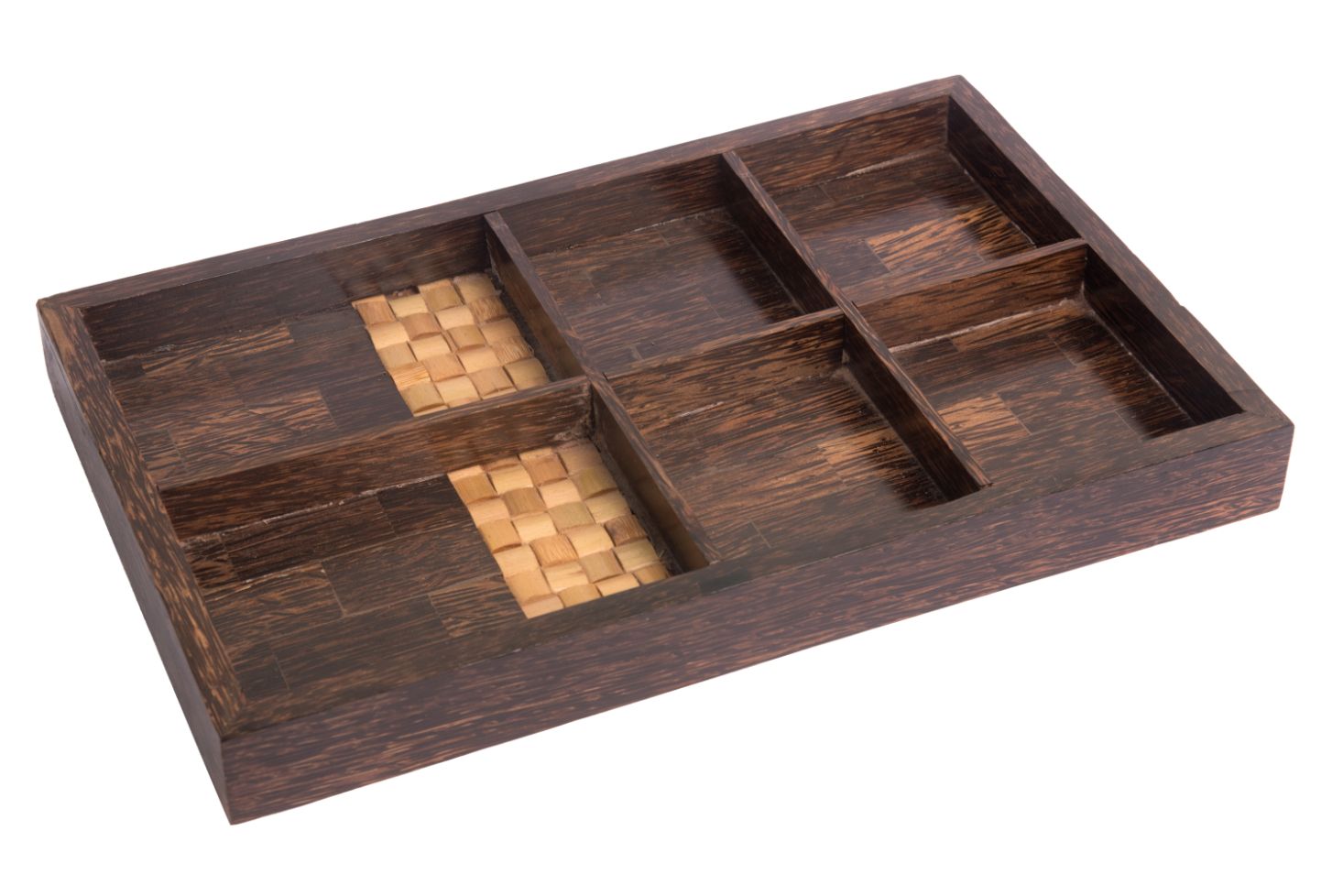 It is made of mdf board, then taadiwood and bamboo is pasted over it. The tray is multi utility, can be used as serving tray, platter, decorative , towel tray, mini bar tray etc.