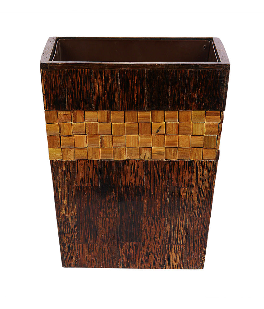 It is made of mdf board, with taadiwood and bamboo pasted over it. It has a removable tin liner insideto make it easy to clean, you can use it as a dustbin or a planter by putting a potted planter in it.