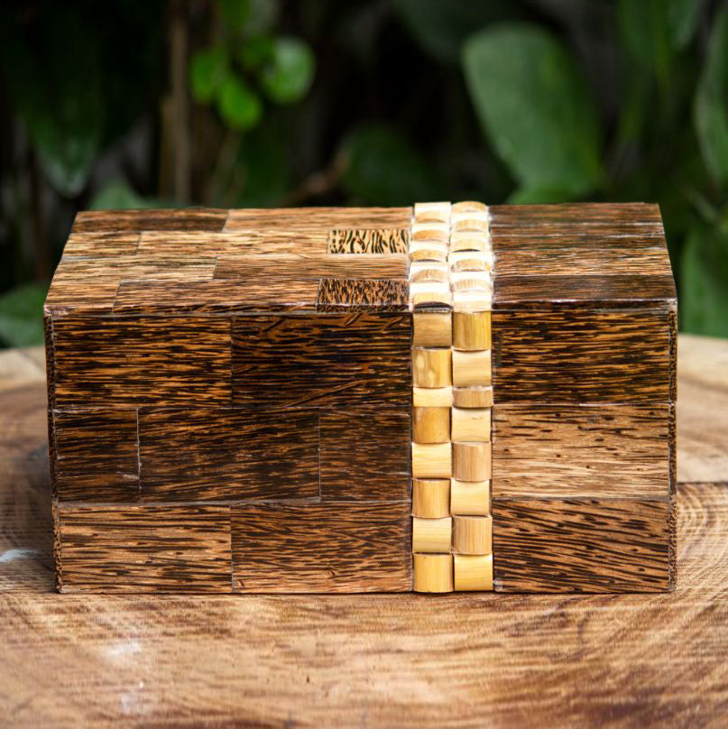It is made of MDf with taadiwood pasted all over with a band of bamboo, It has a division inside to keep tea bags and sugar bags etc.