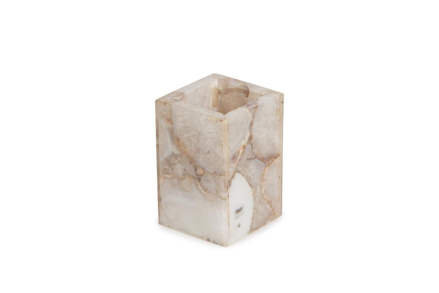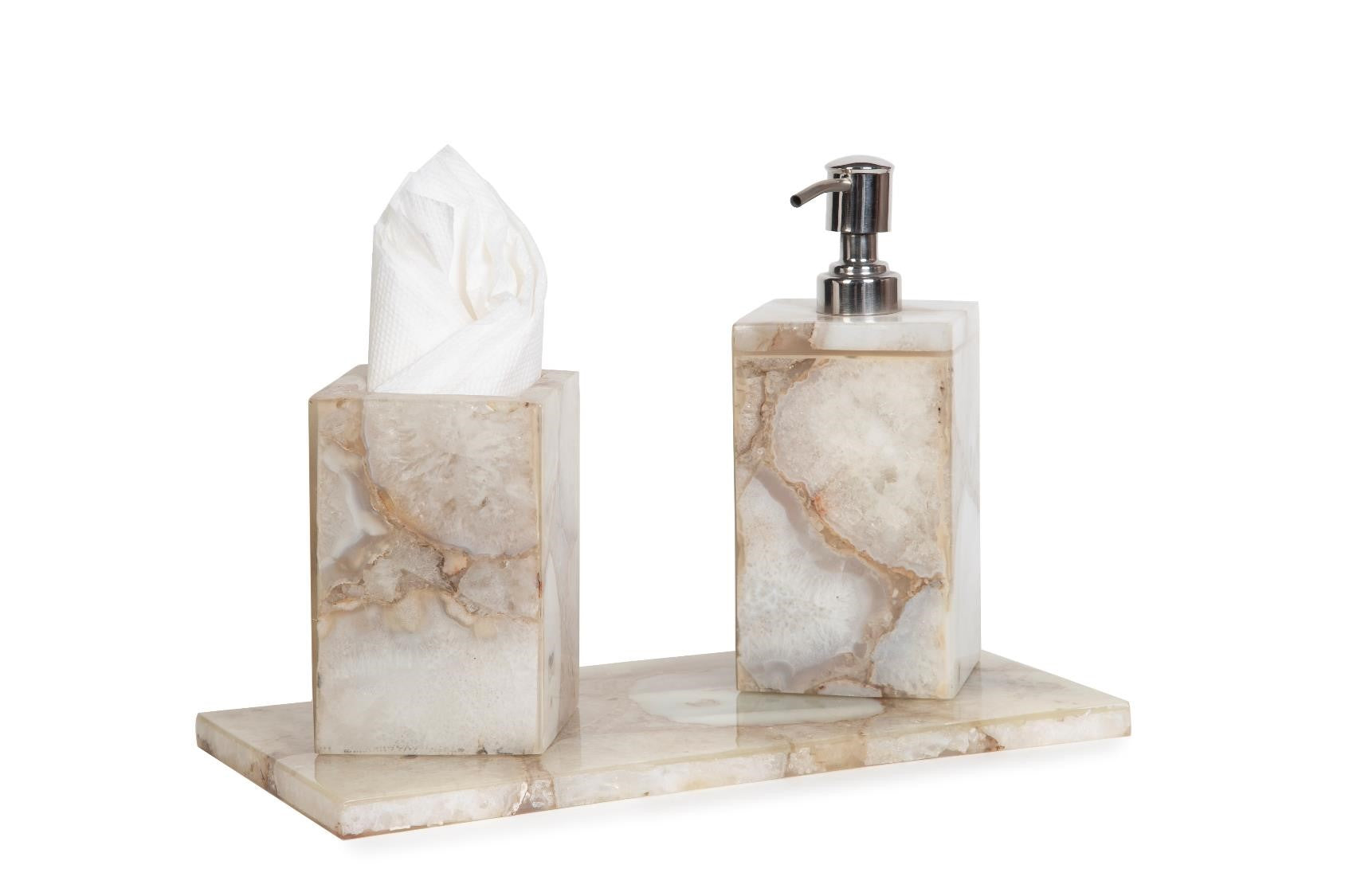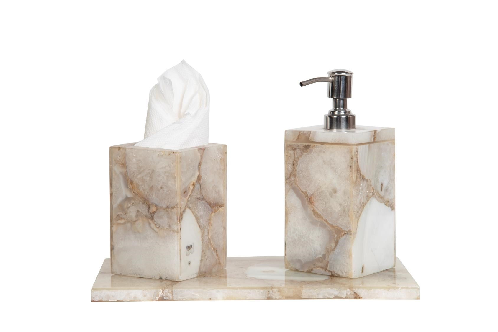 The bath set is made of agate stone., it contains soap dispenser, tray and tooth brush holder.