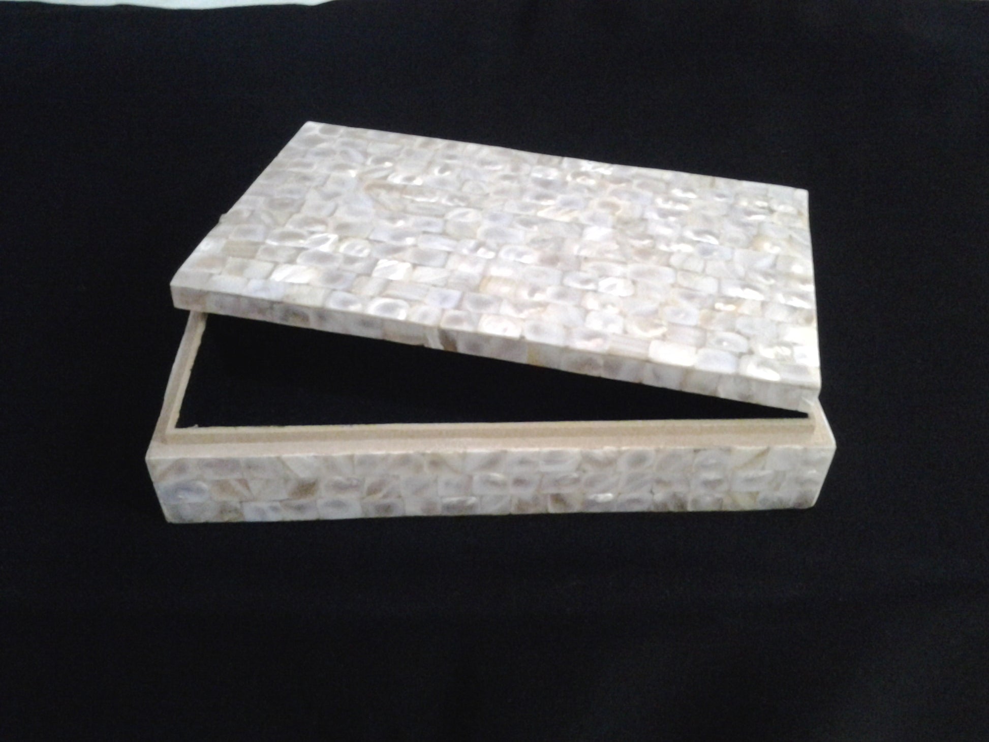 The se boxes are made of MDF , then white mother of pearl pasted all over, inside we put black felt.