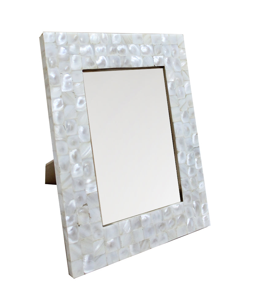 it is made of mdf board with white mother of pearl pasted. The size of photo for this frame will be 6"x4" The weight is 370 gms.