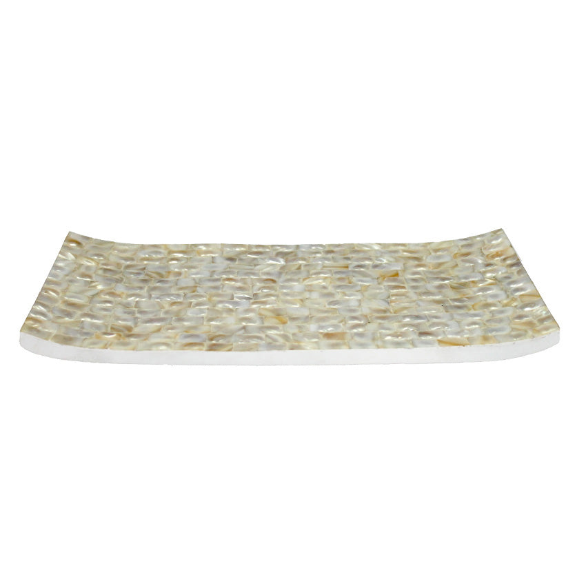 It is made of mdf board, then white mother of pearl is pasted over it. The tray is multi utility, can be used as serving tray, platter, decorative , towel tray etc.