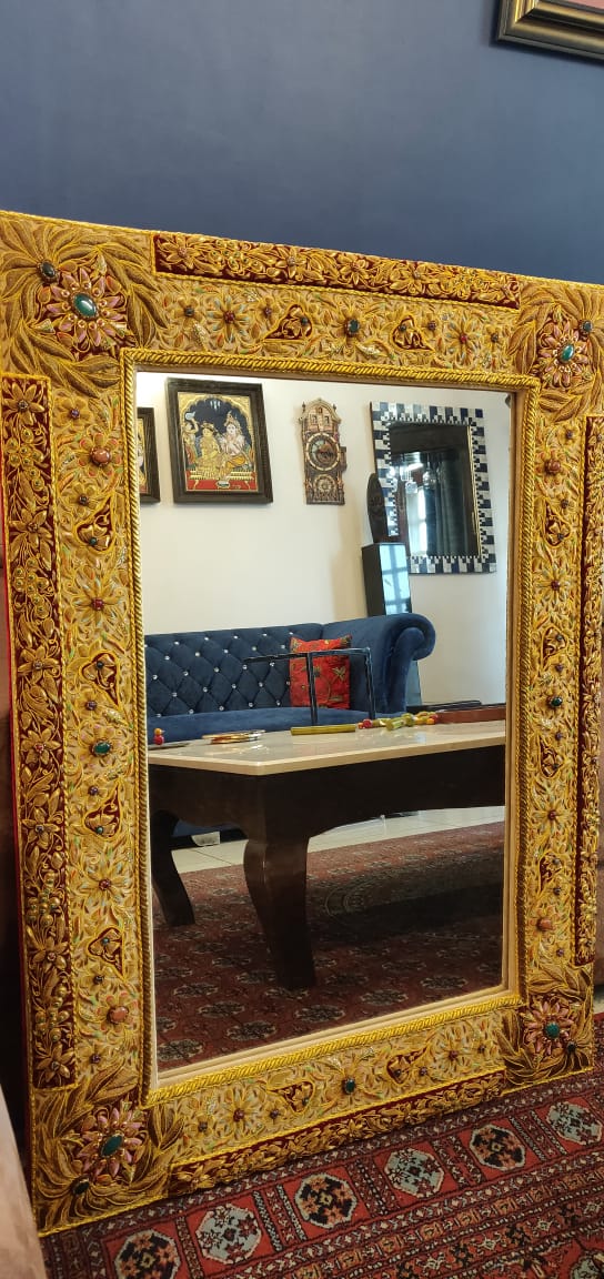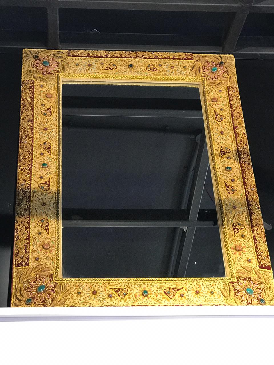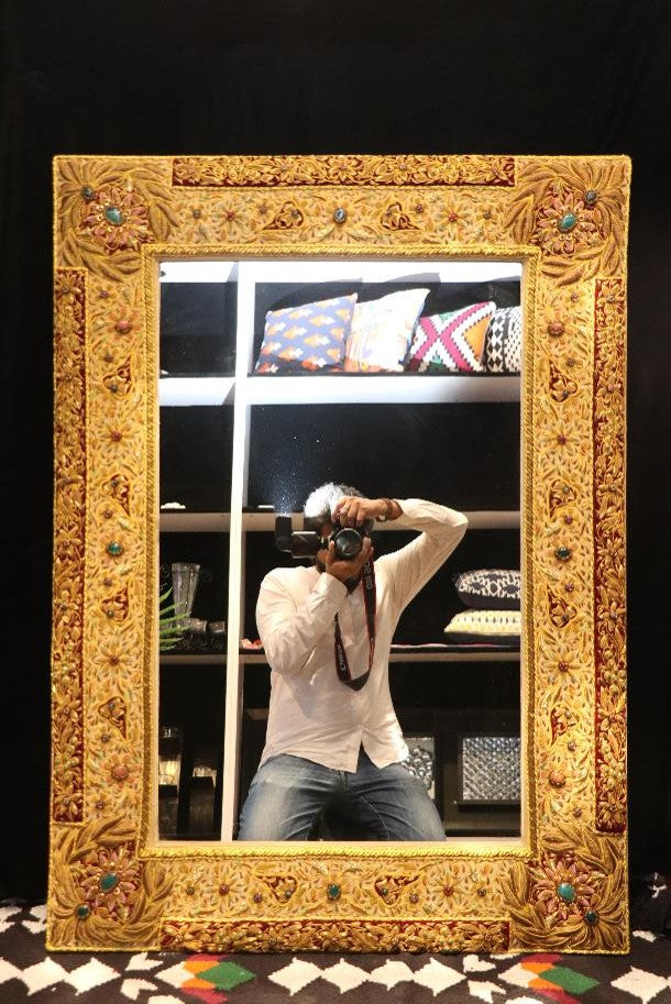 A traditional design and zardosi embroidered to make a mirror frame. It is so decorative and beautifully done by our craftsmen. Very intricate. Real gemstones are used in embroidery with gold thread work.