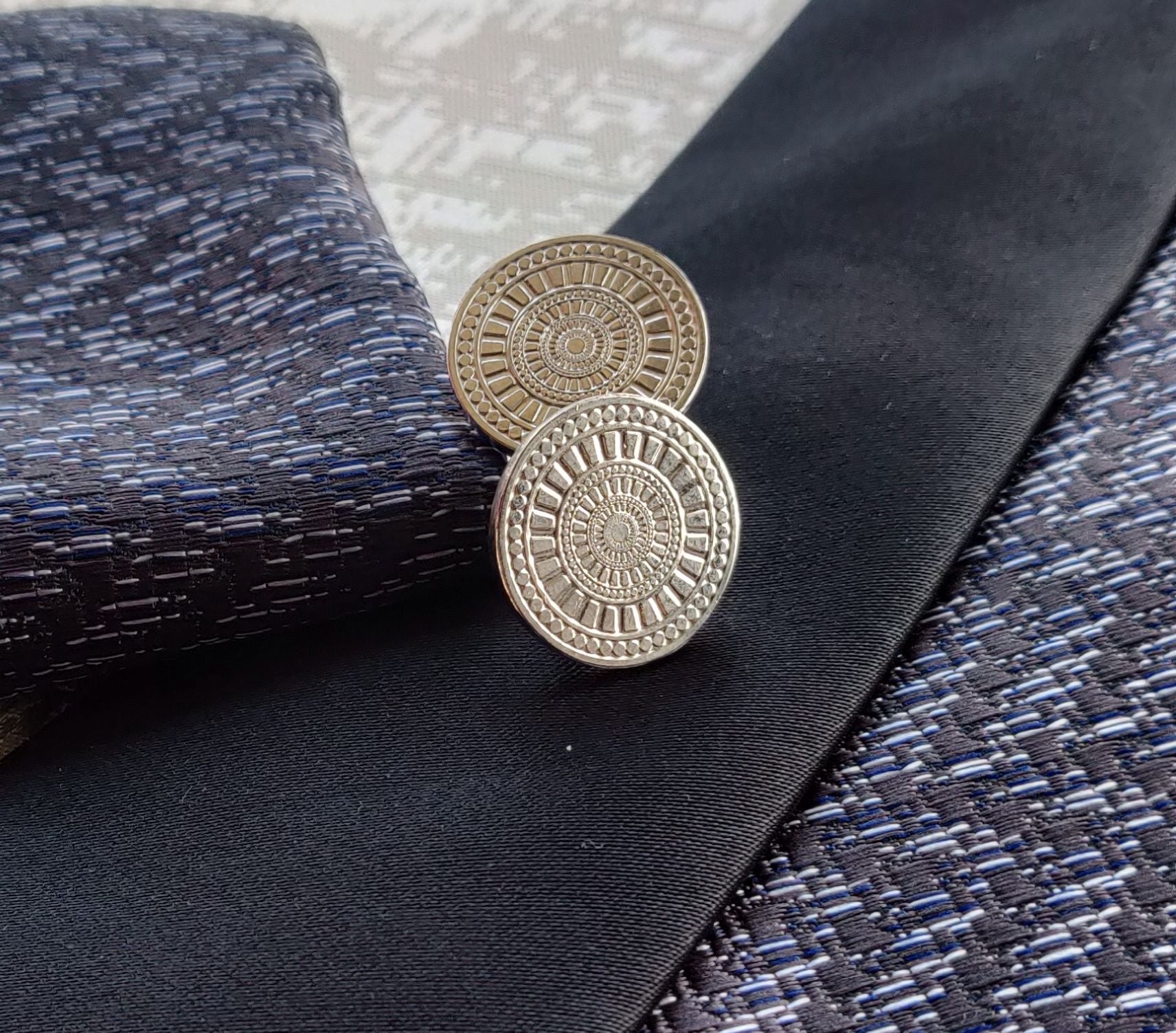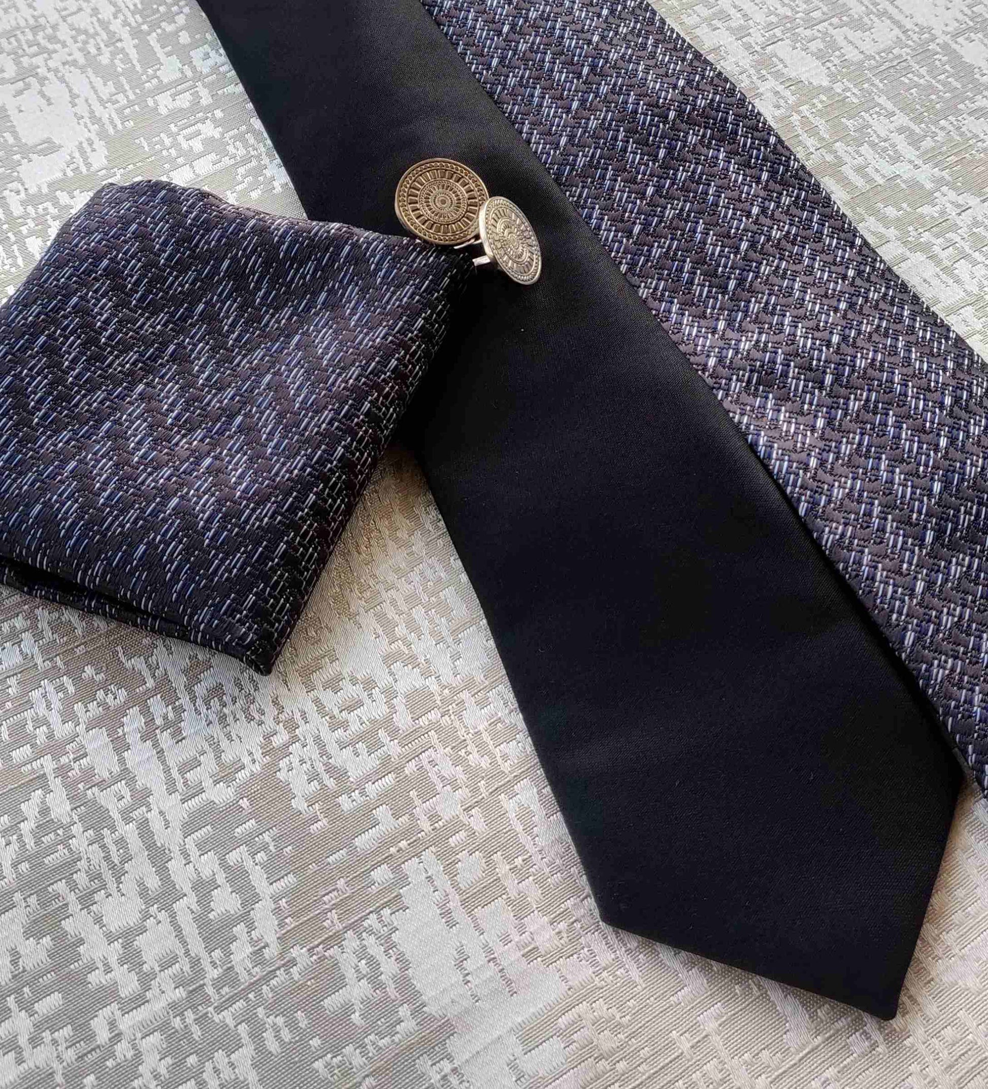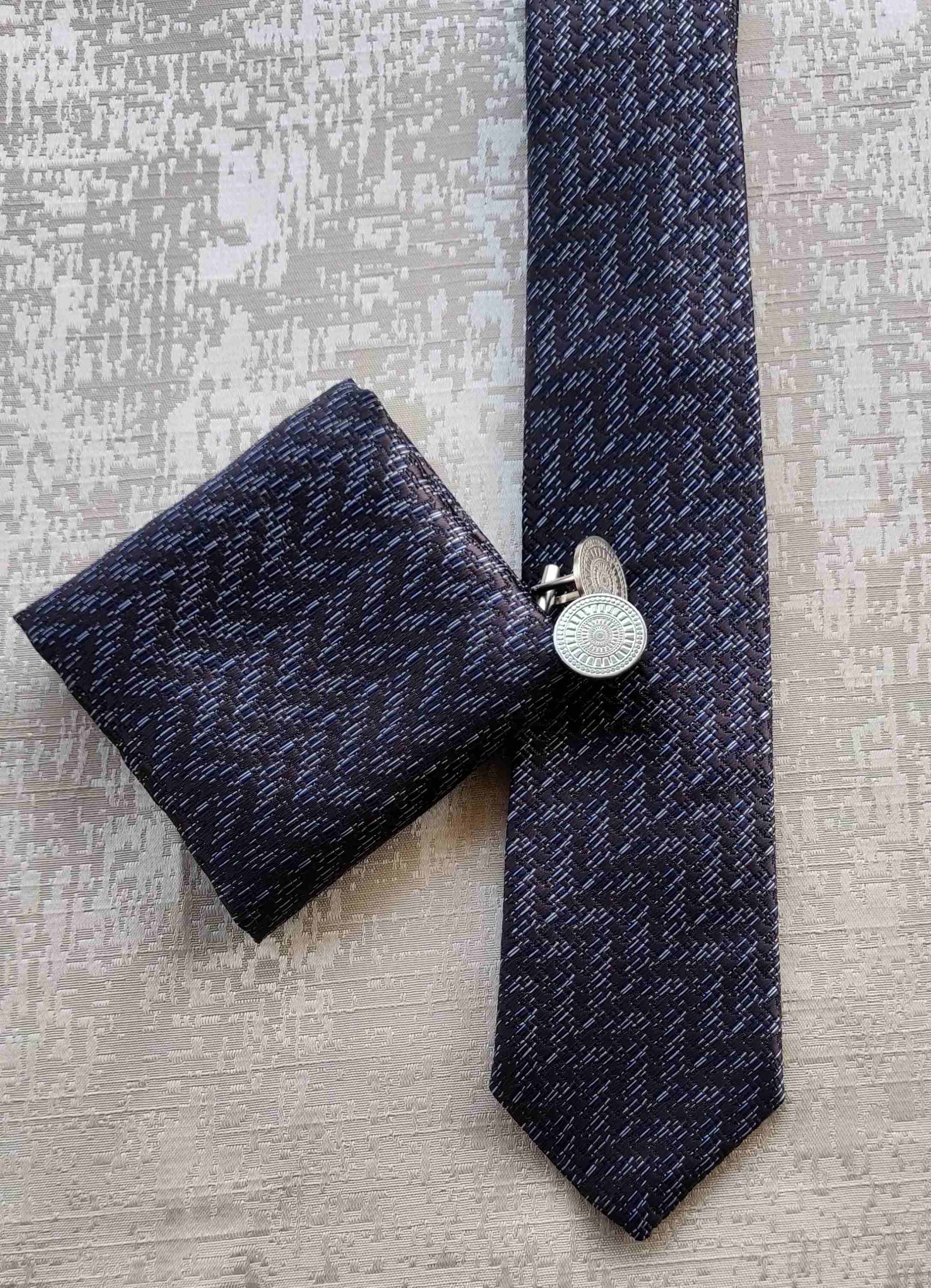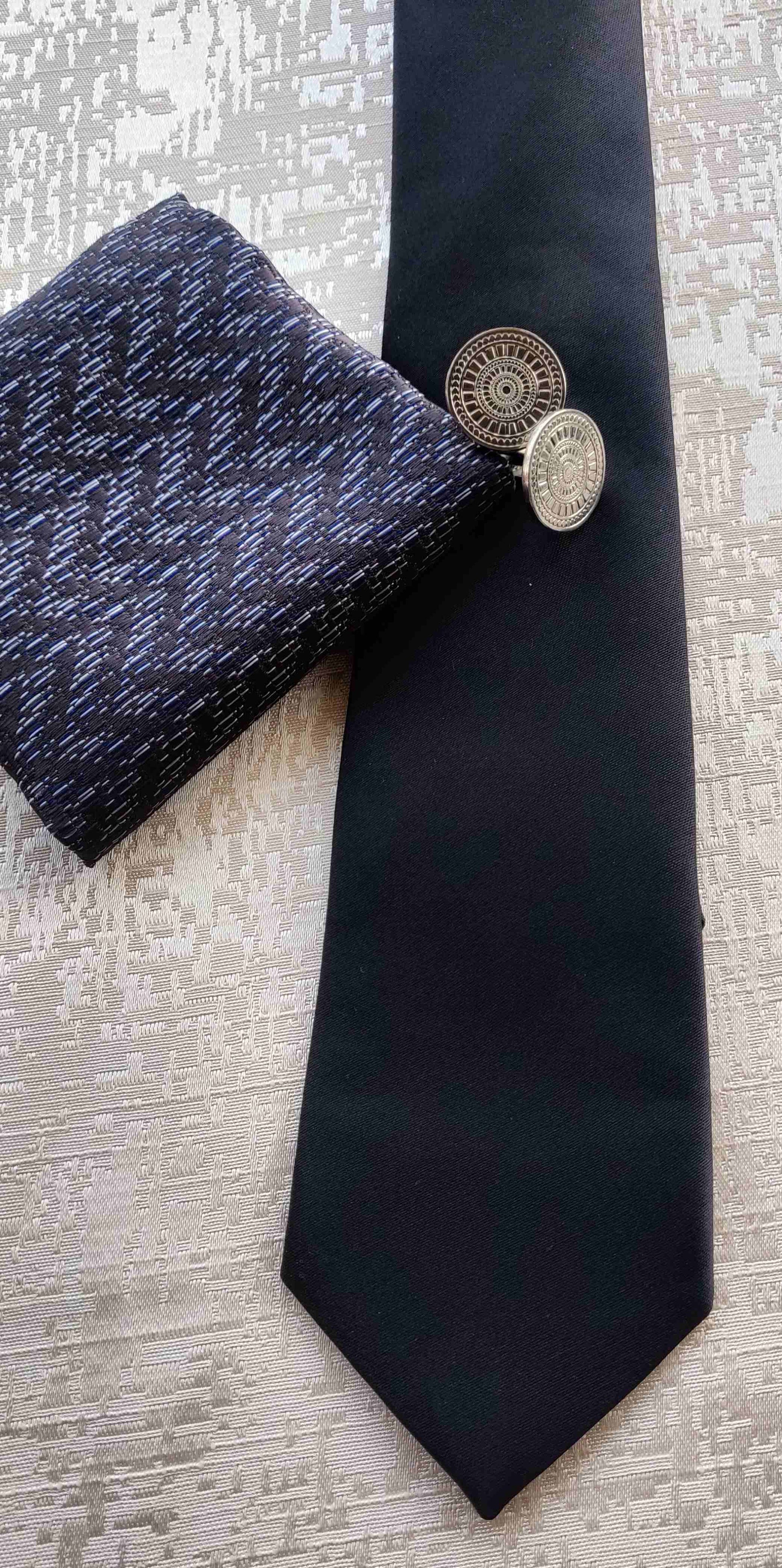 Cufflinks : 0.75 inch diameter, Pocket Square : 10x 10 inches A stunning combination of two different ties with a pocket square and cufflinks which can be used with either of them. Both the ties, one of which is plain and the other one with a unique design, are in superior micro fibre fabric and can be used as both formal and party wear. The cufflinks are engraved in pure brass and has a diameter of 0.75"and compliments both ties exceptionally, making this box a perfect gift. The maximum width of the tie 2.5" and the length of tie is a standard 59" .