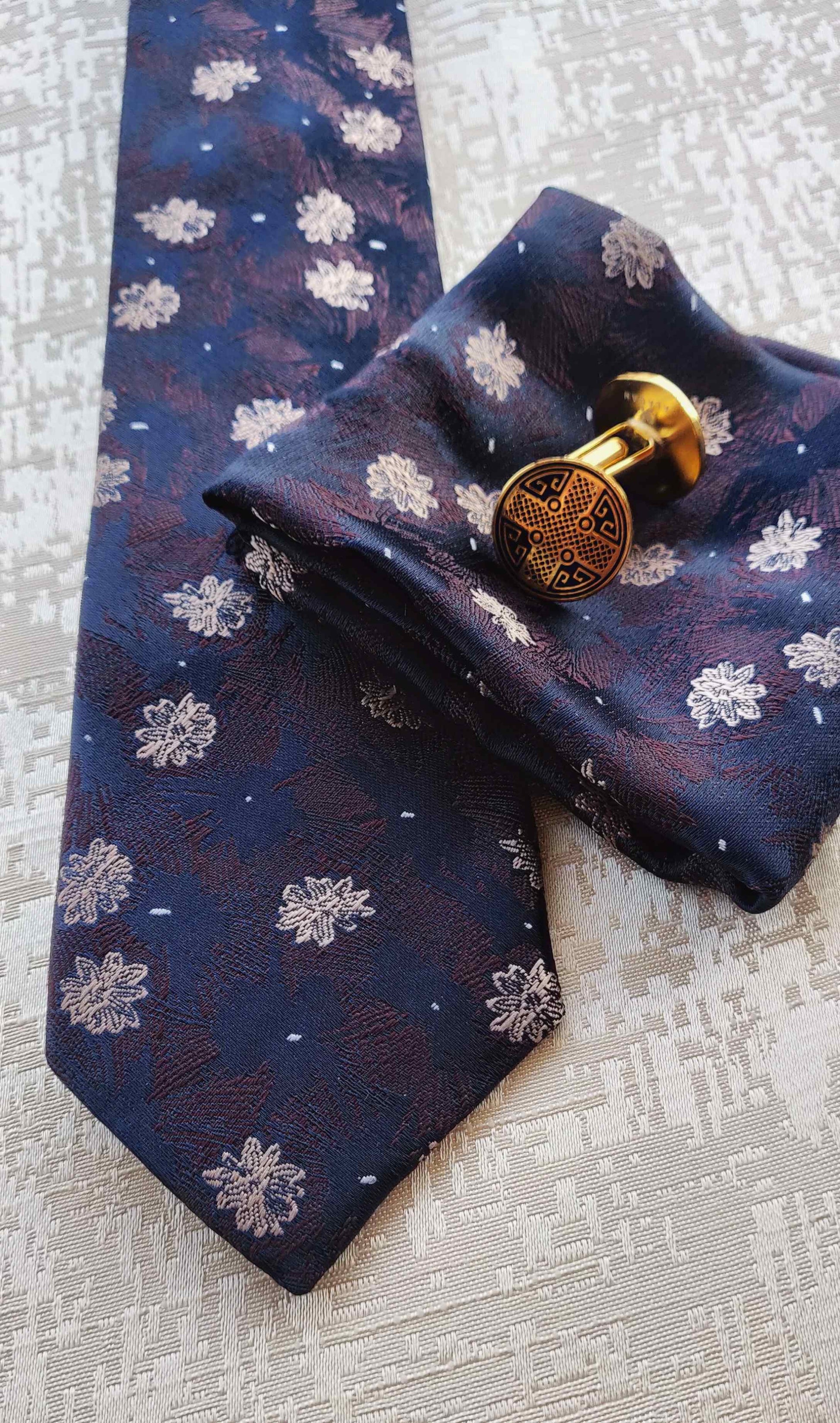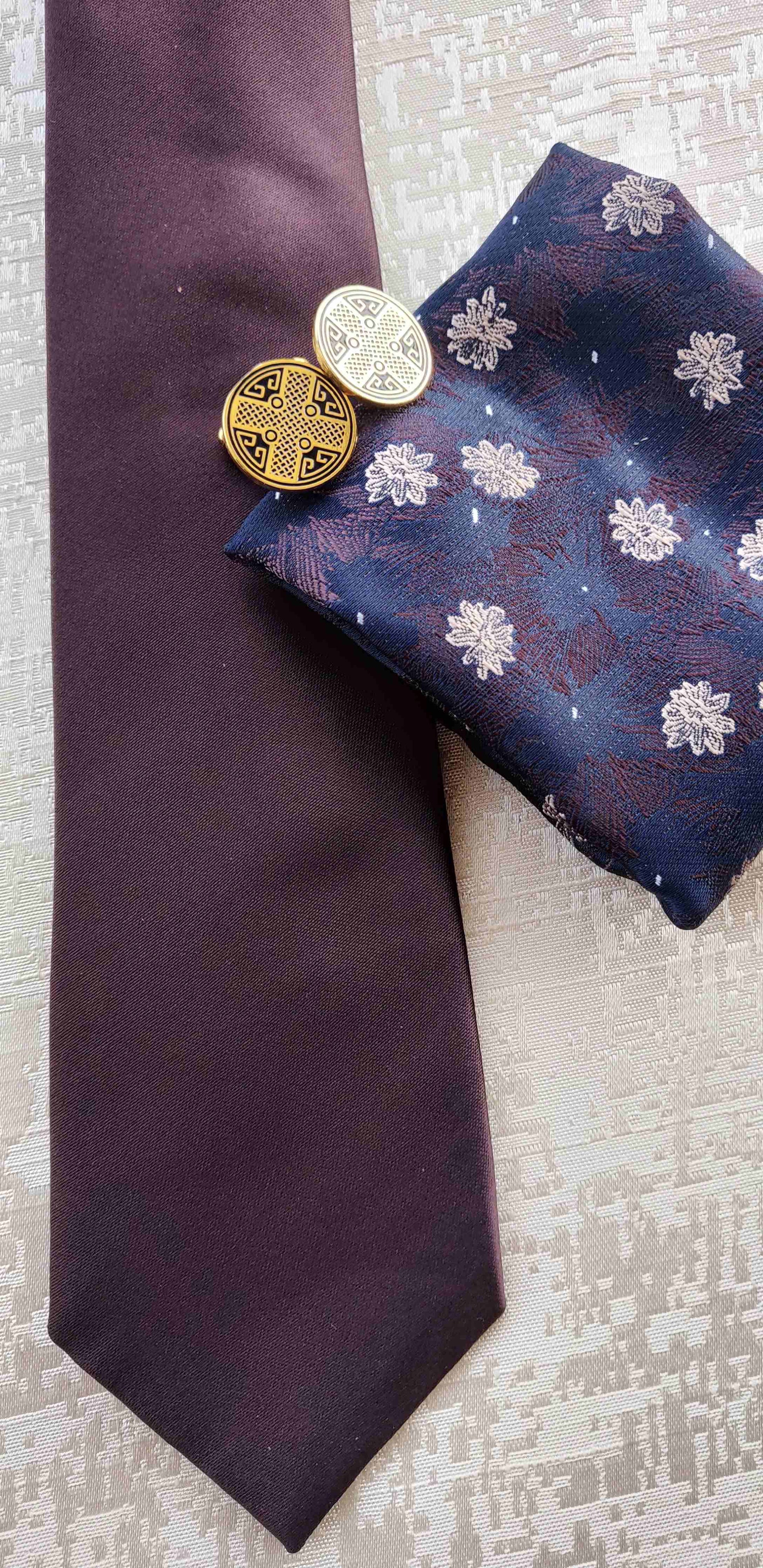A stunning combination of two different ties with a pocket square and cufflinks which can be used with either of them. Both the ties, one of which is plain and the other one with a unique design, are in superior micro fibre fabric and can be used as both formal and party wear. The cufflinks are engraved in pure brass and has a diameter of 0.75"and compliments both ties exceptionally, making this box a perfect gift. The maximum width of the tie 2.5" and the length of tie is a standard 59" .