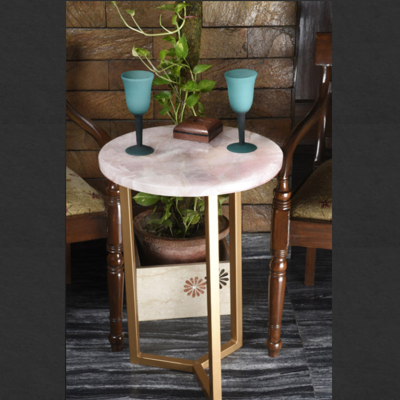 The table top is of rose quartz. The pieces are cut in random design and pasted.