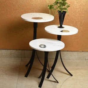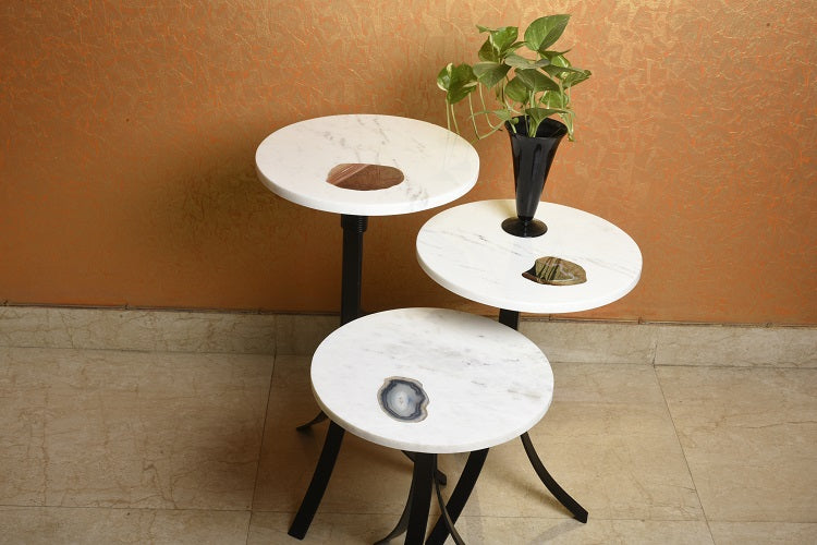 The set is of three tables. the base is metal. The top is made of white marble, the size of tops are 30.48cms each. One Agate stone is inlay on each top. the color of agates are different in each top.