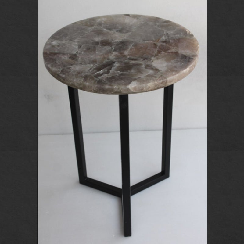 The table is of smoky quartz. The quartz is cut into random design and pasted together.