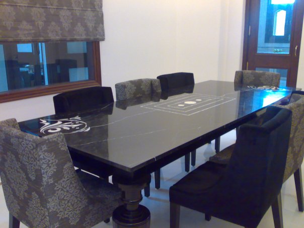 We made this black marble dinning tabletop for a client. It has white mother of pearl inlay.