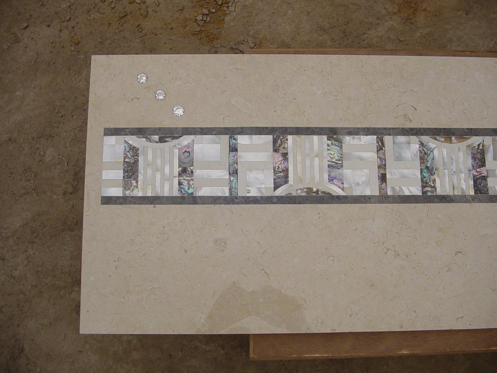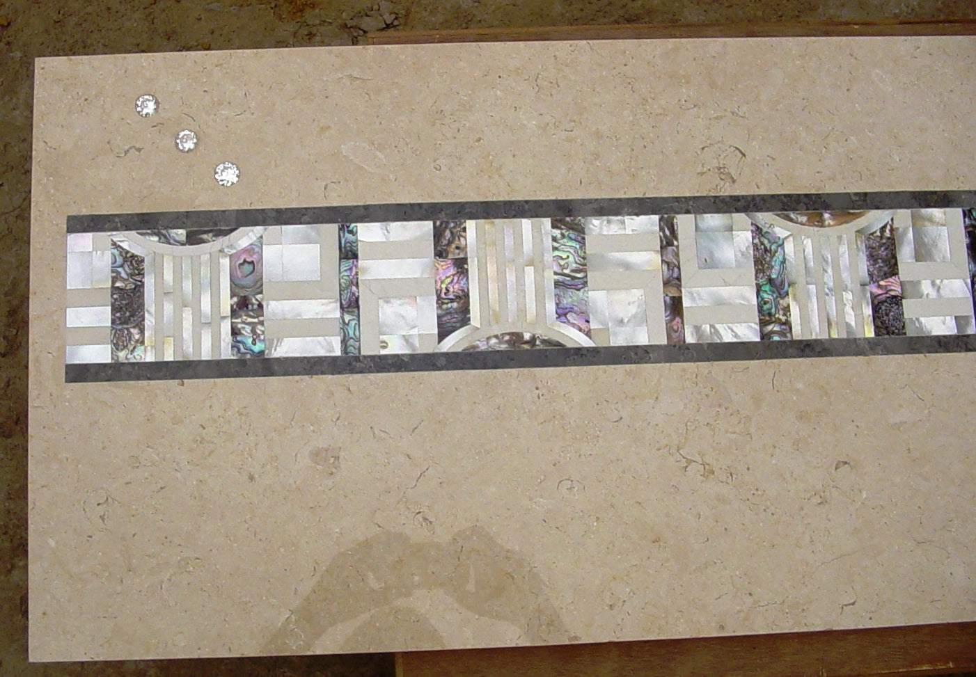 This is console top made for a client. Marble inlaid with white mother of pearl and black mother of pearl with Swarovski pieces.