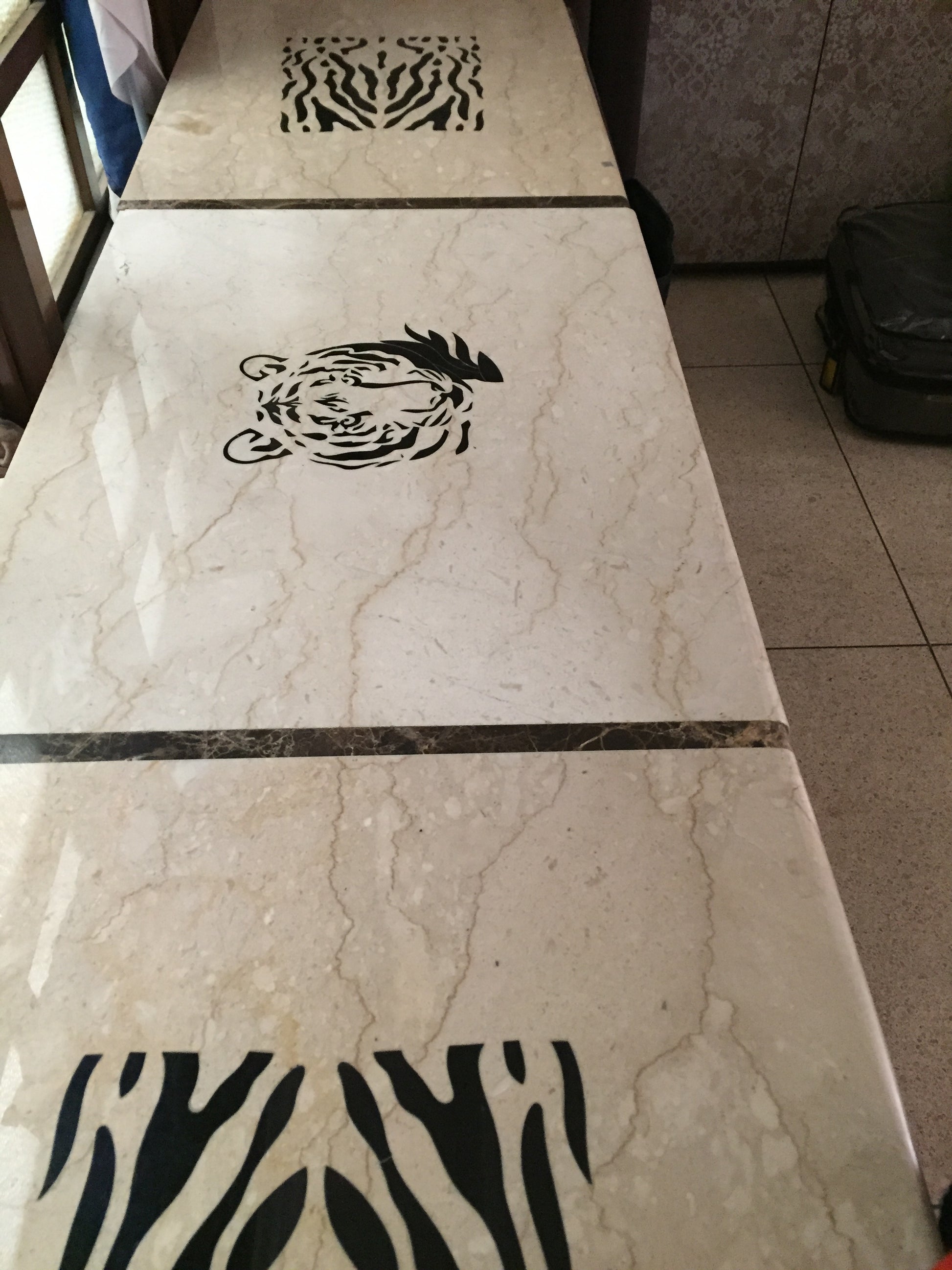 The wooden cabinet top is covered with marble tops, they are inlaid in tiger prints.