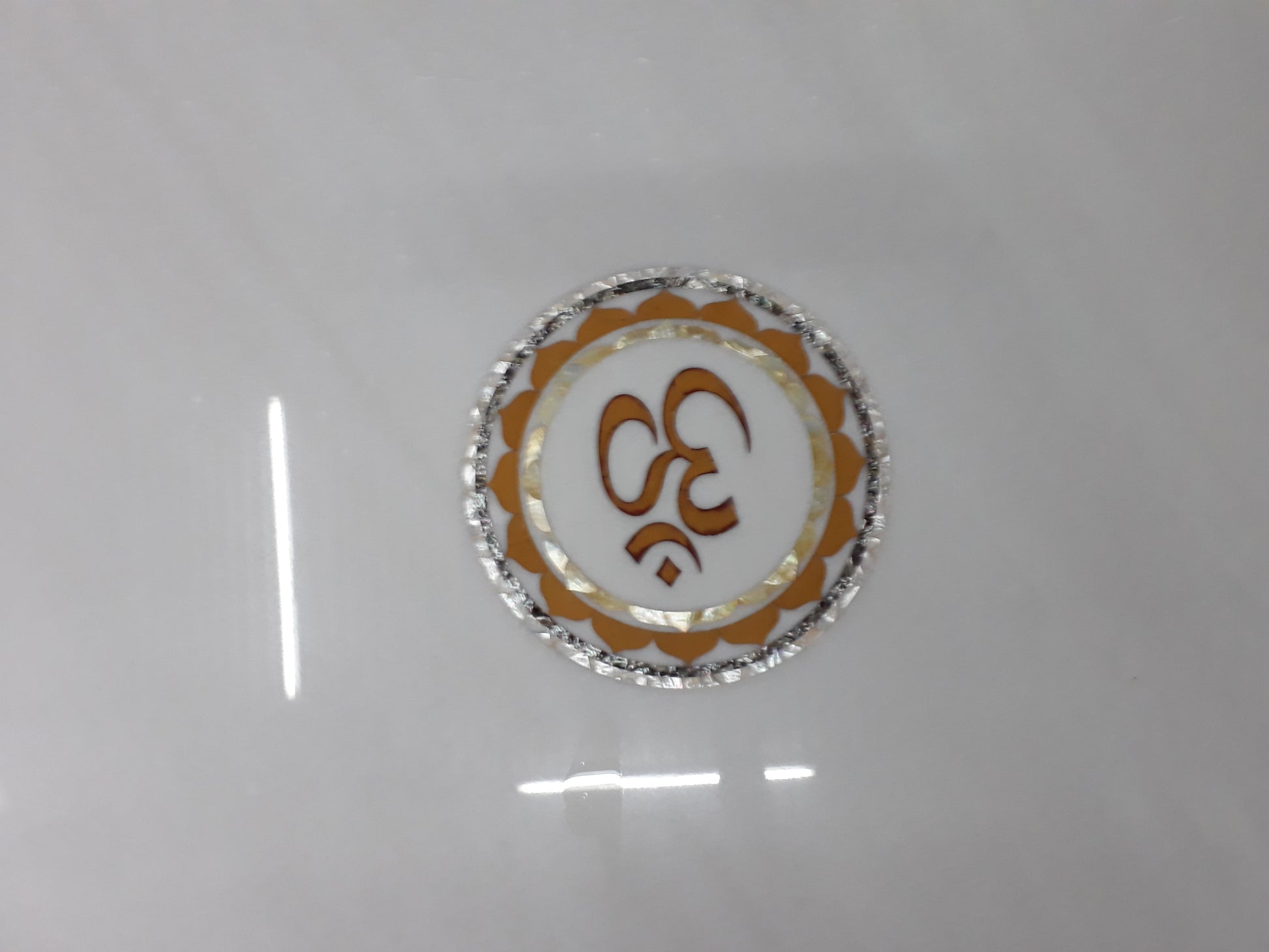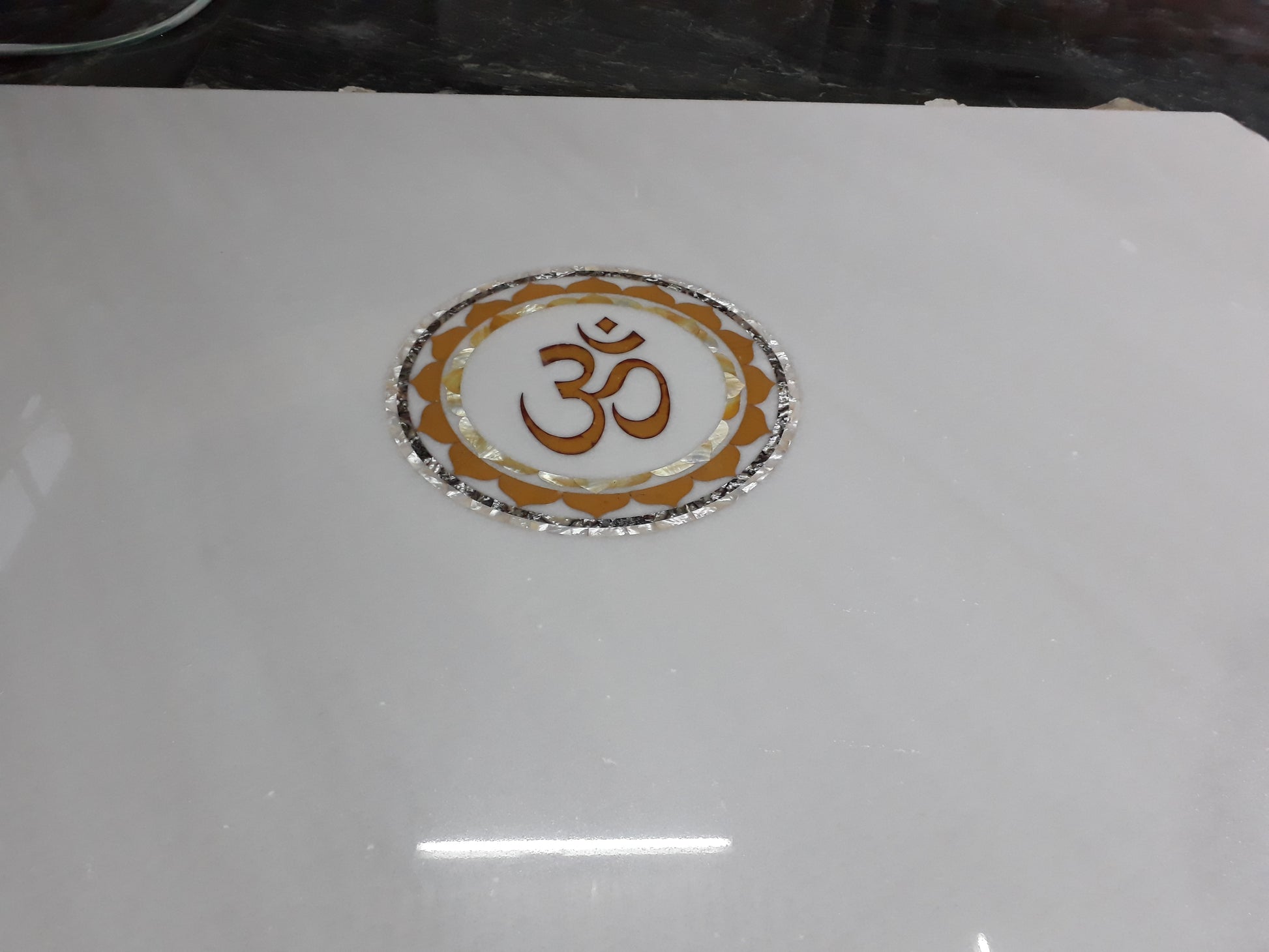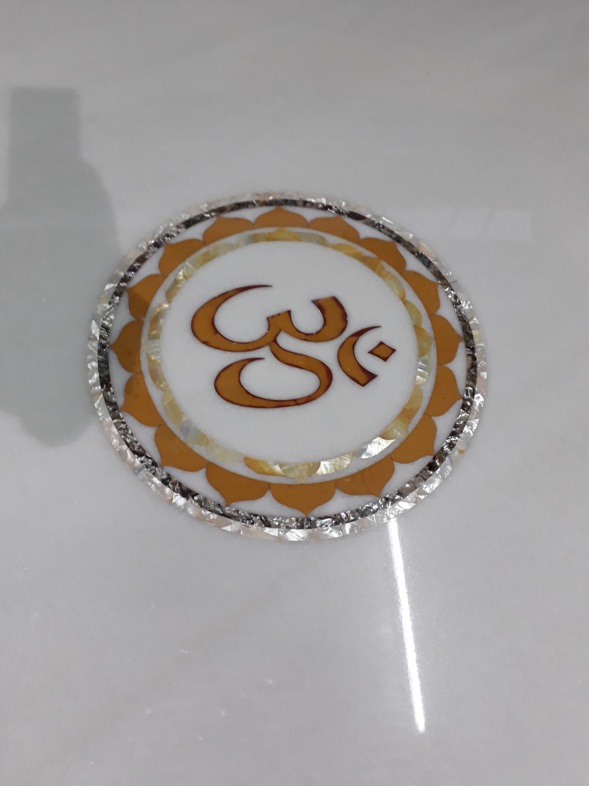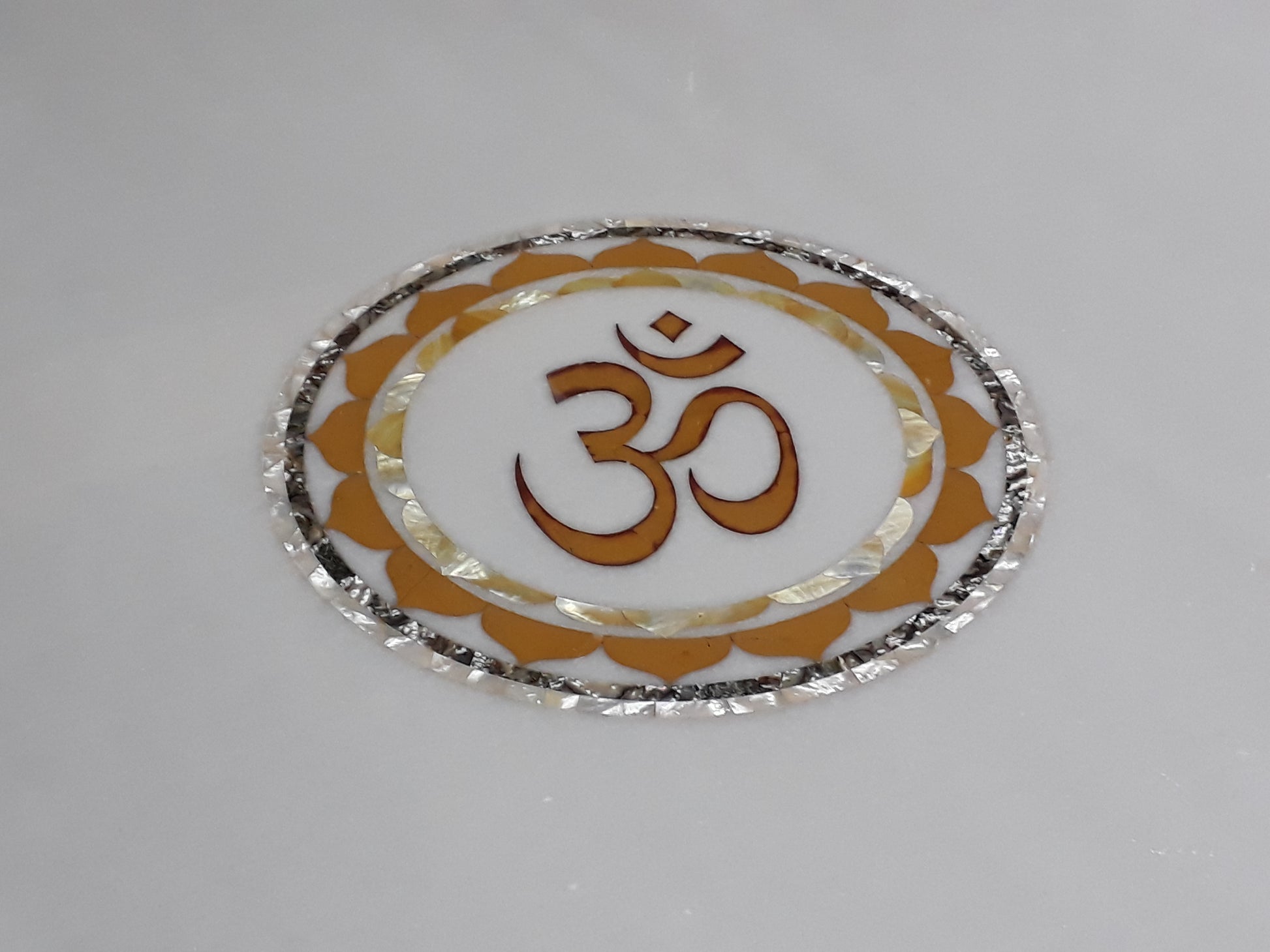 White marble used for background, "OM" inlaid with semiprecious stones.