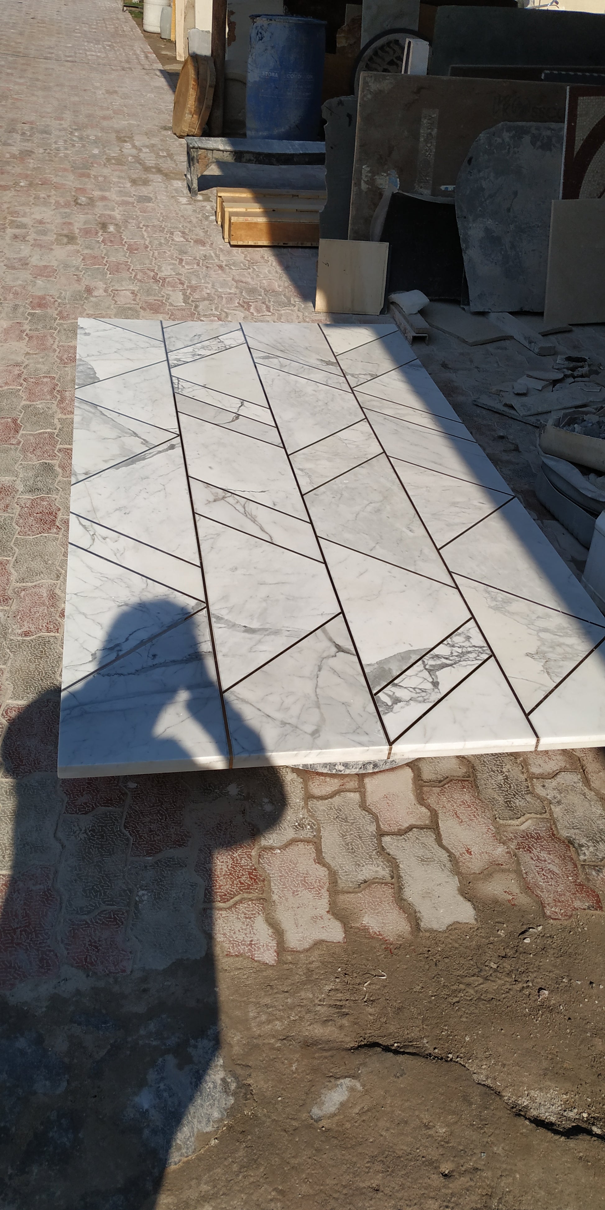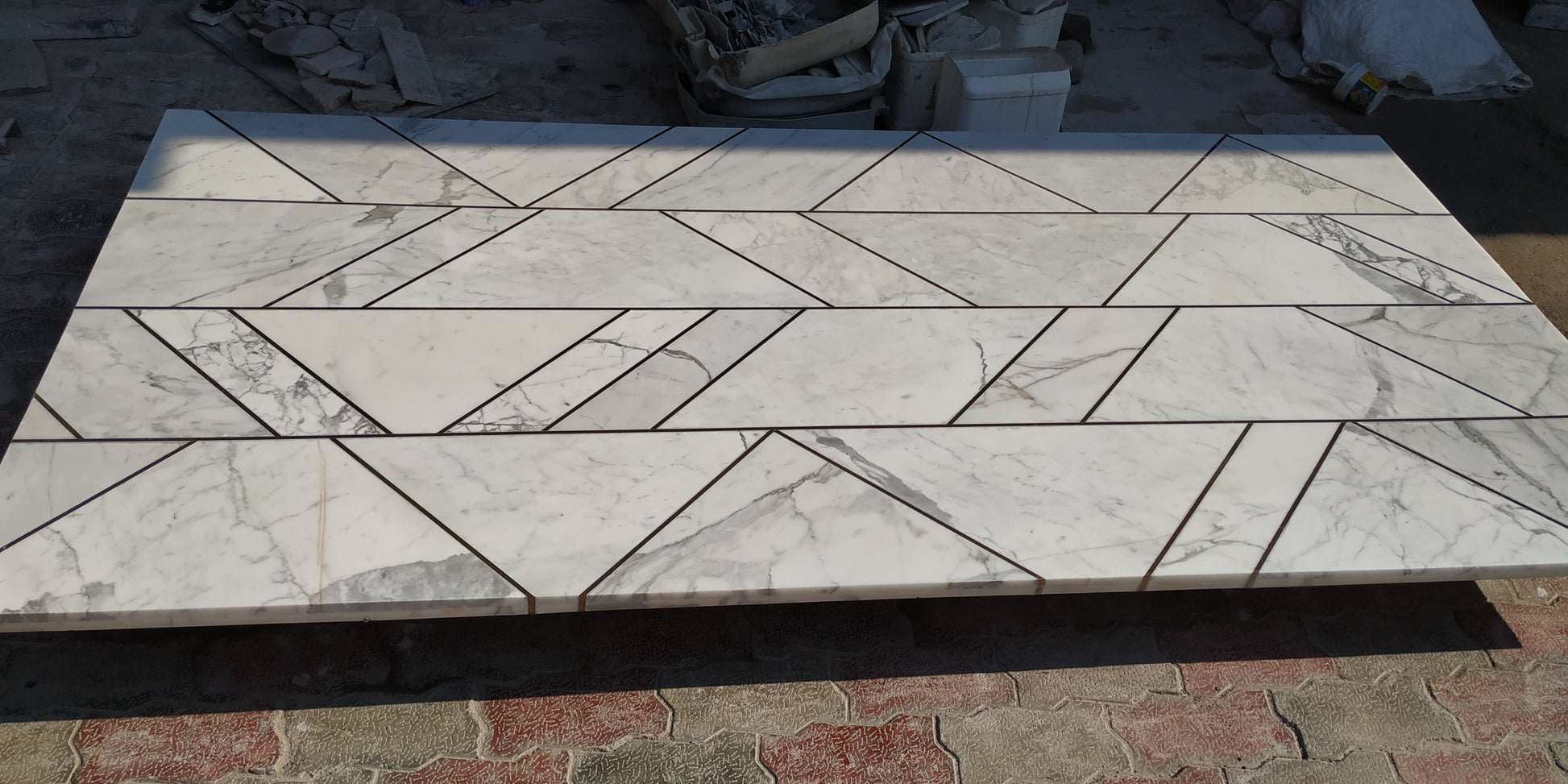This Is white Marble tabletop inlay with brass stripes.