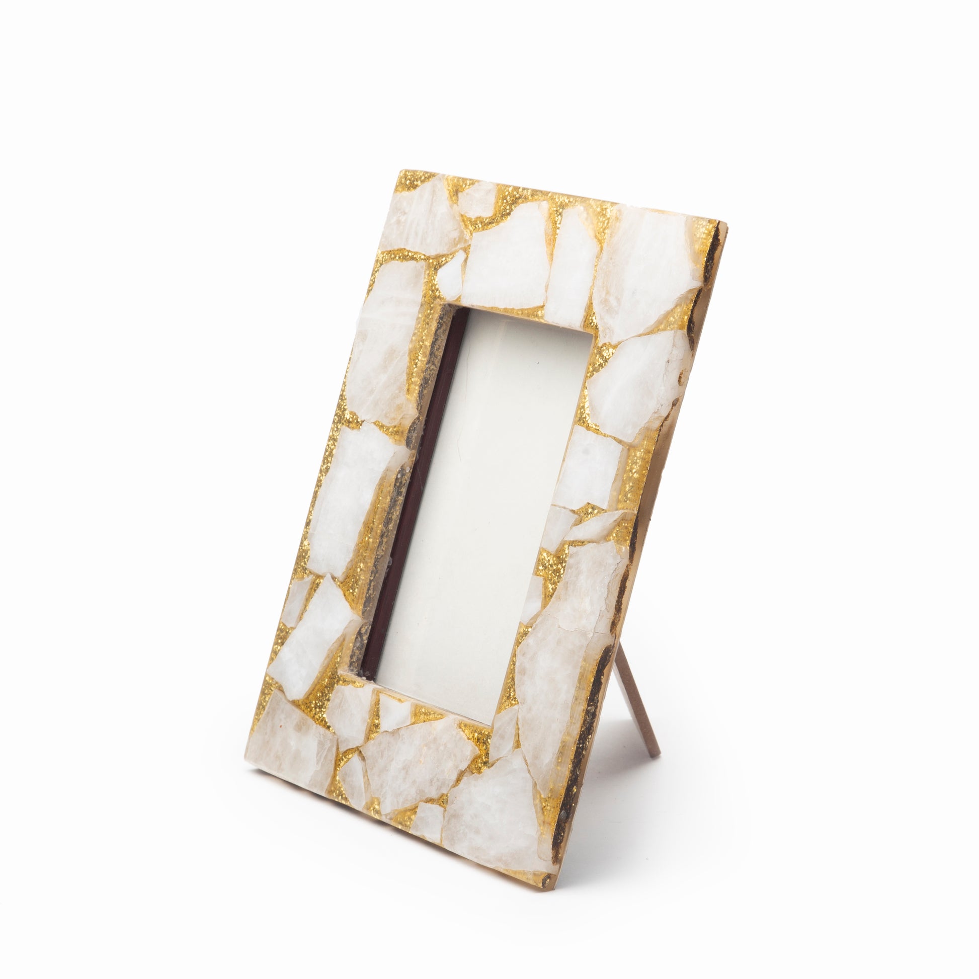 This photo frame made in white quartz with golden frame. It is made to fit photo size 6x4 inches.