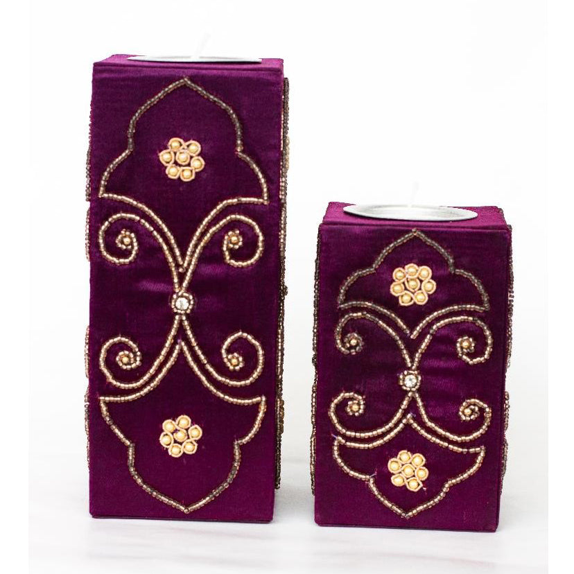 It is made of mdf board , pasted cloth all over with hand embroidery. It is very different and looks nice. A good gift for all occasions.It is a beautiful piece which is embroidered with beads. Tealights comes in a set of two. The weight of 2 tealights are : 305gms. We have given a traditional look to the tealights.