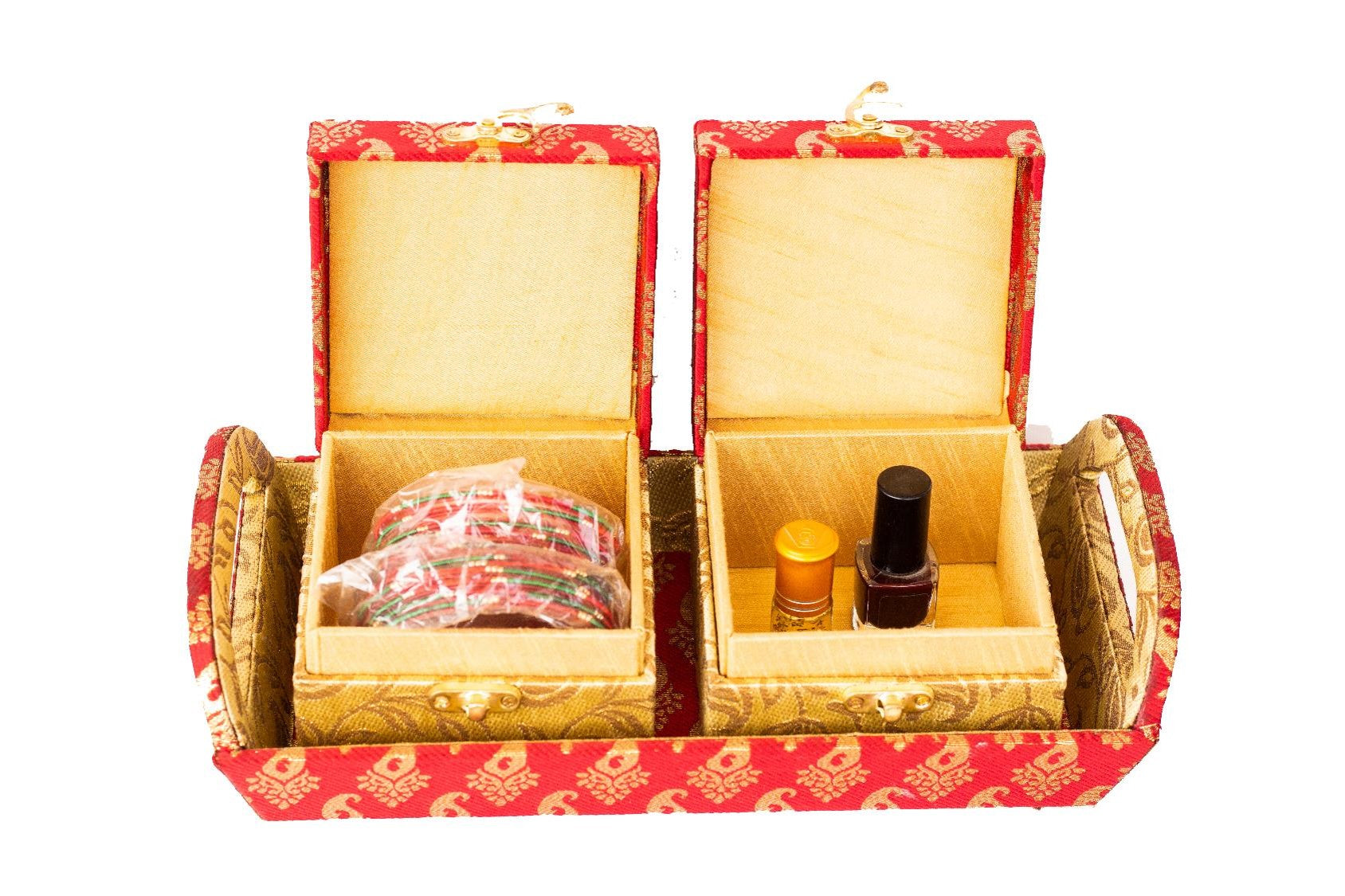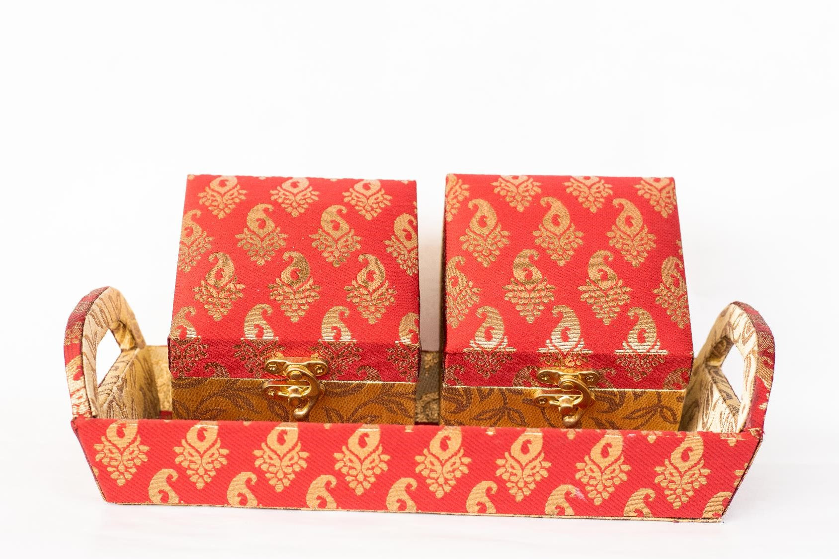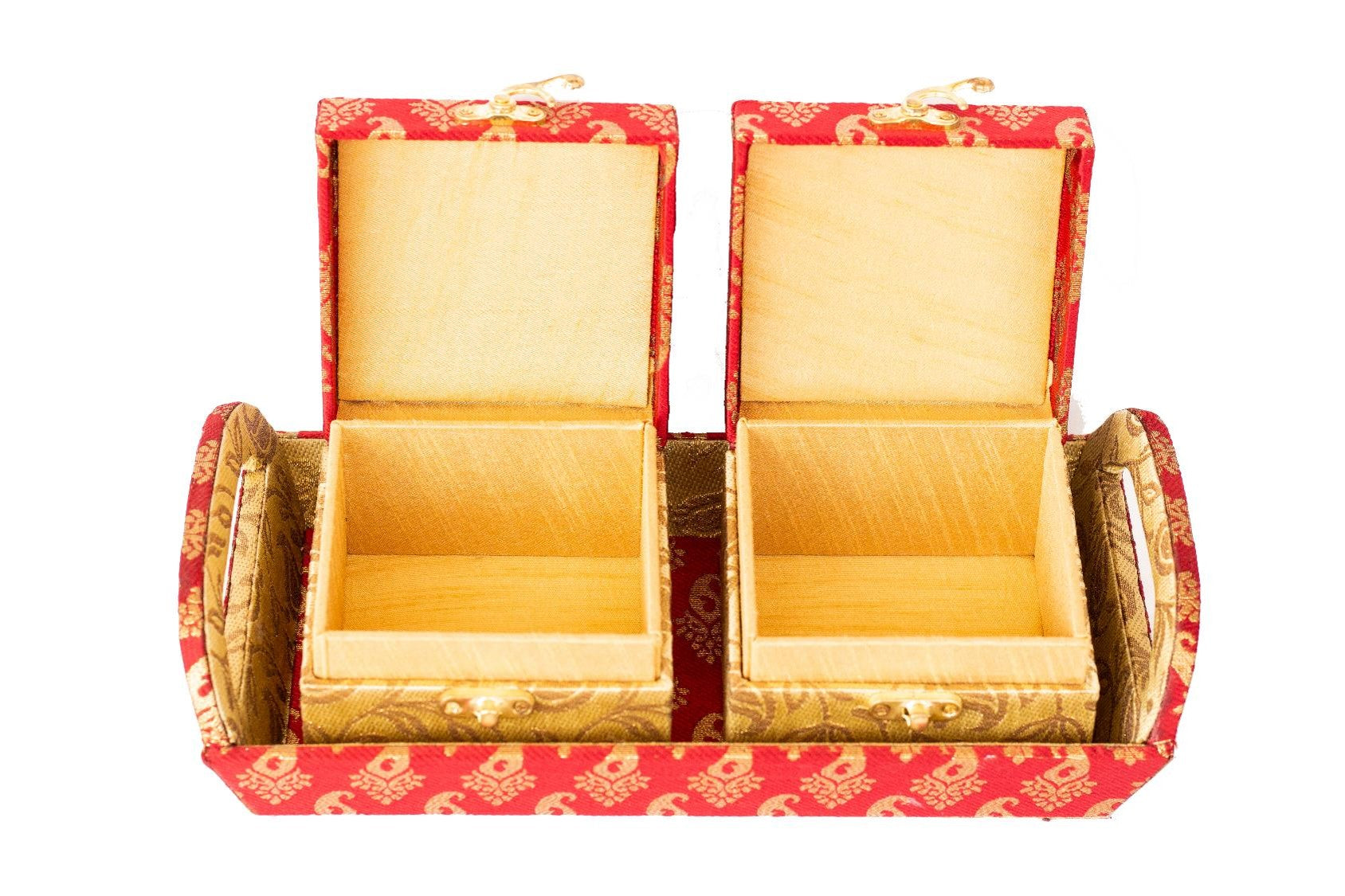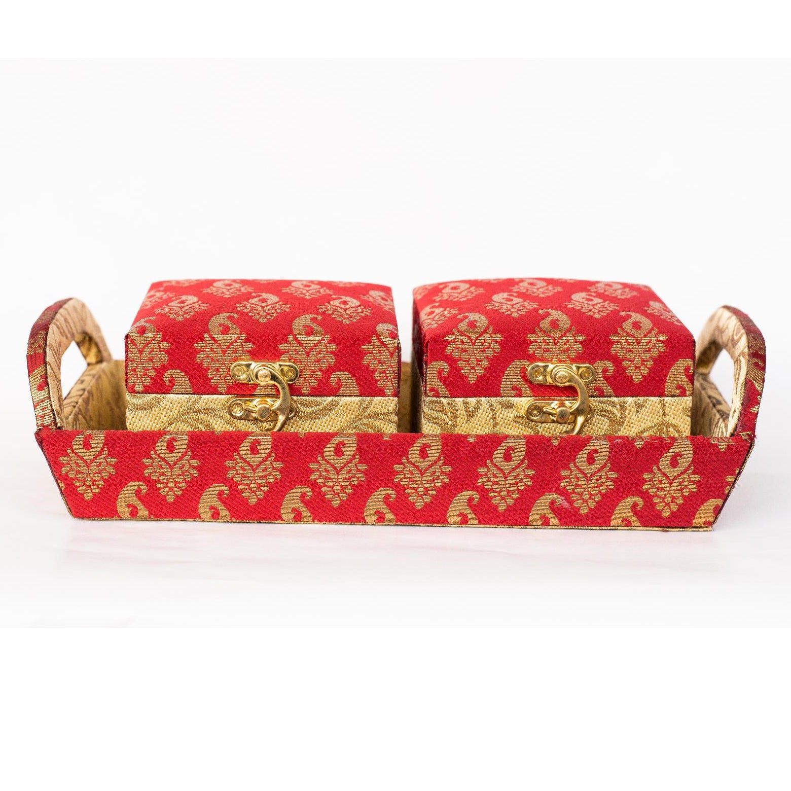 It is a beautiful piece , a multipurpose box for return favours. Tray size: 25x15x4, Box size: 10x10x6, weight is 542 gms. It is made of thick ply and banarasi cloth pasted all over.
