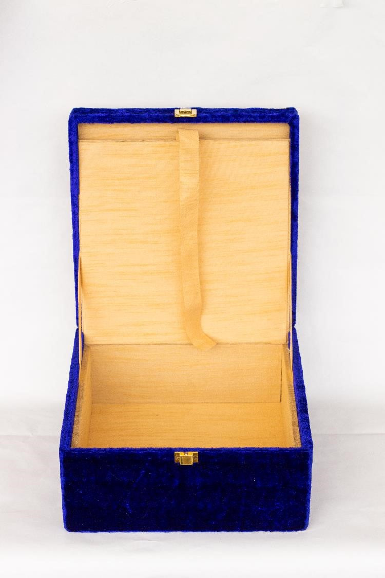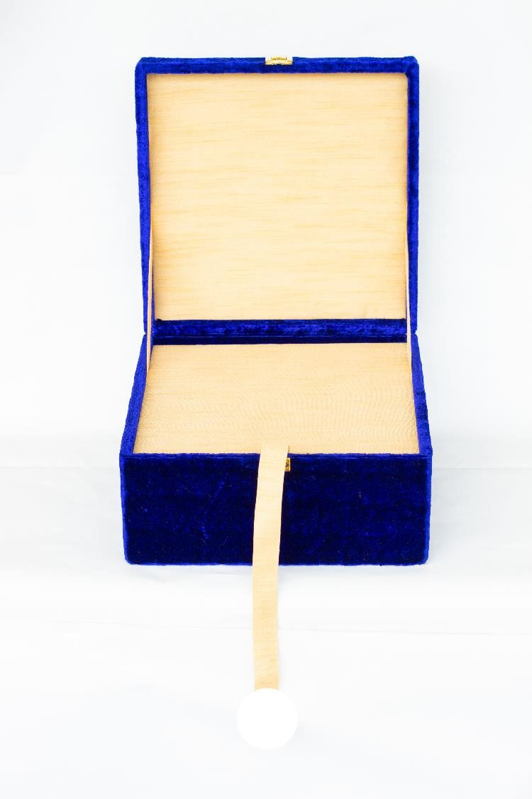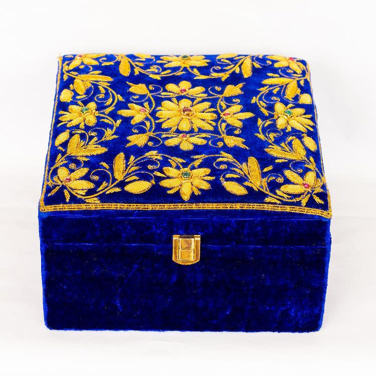 An exotic, handcrafted zardozi box, specially designed in two section to accommodate invitation cards in one section and dry fruits/chocolate/ etc in the other. It is a multi-purpose box which in itself is a gift for any occasion like weddings, house warming, bridal shower, trousseau, etc.