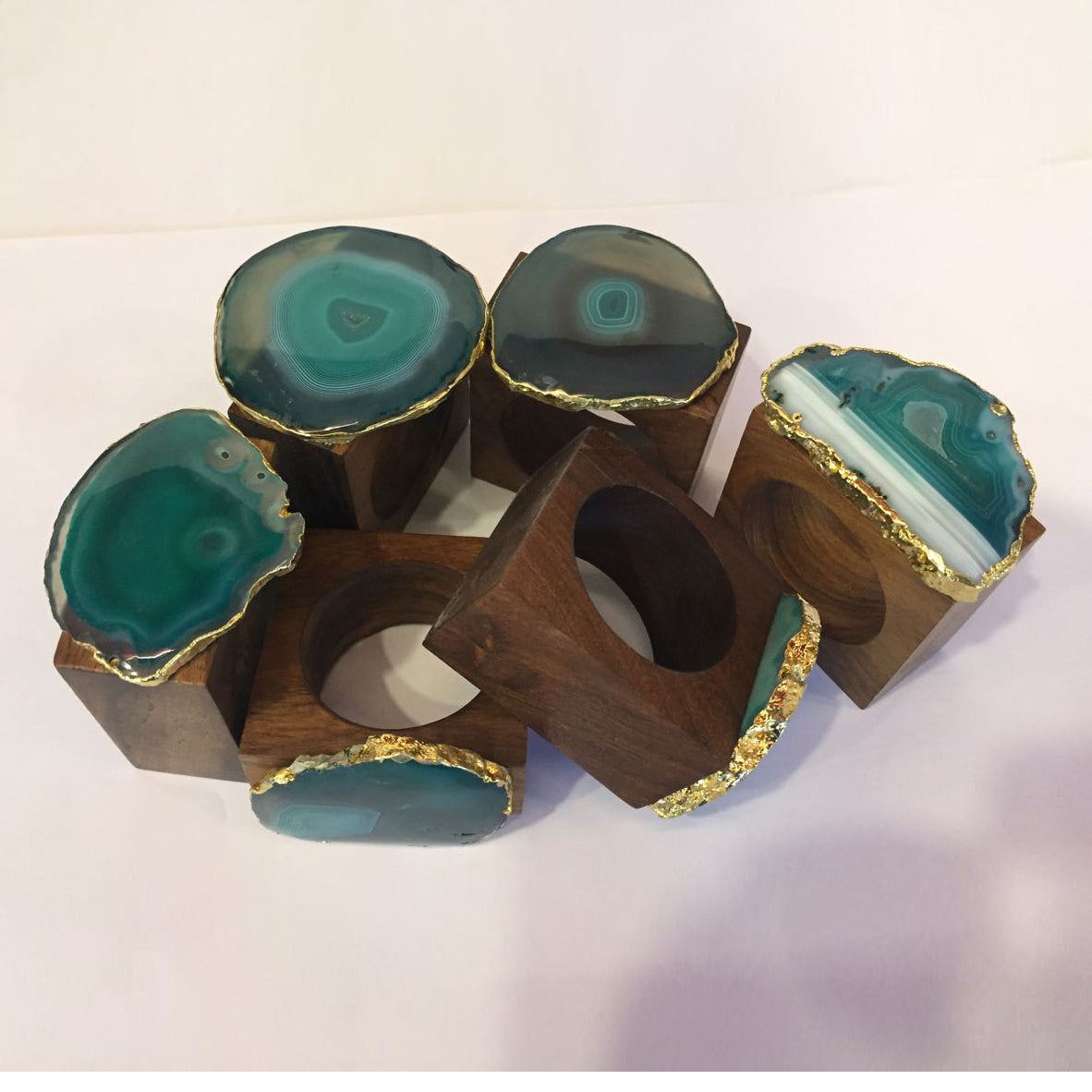 This is a set of 6 napkin rings , wood base. The green agate has been fixed on each ring.
